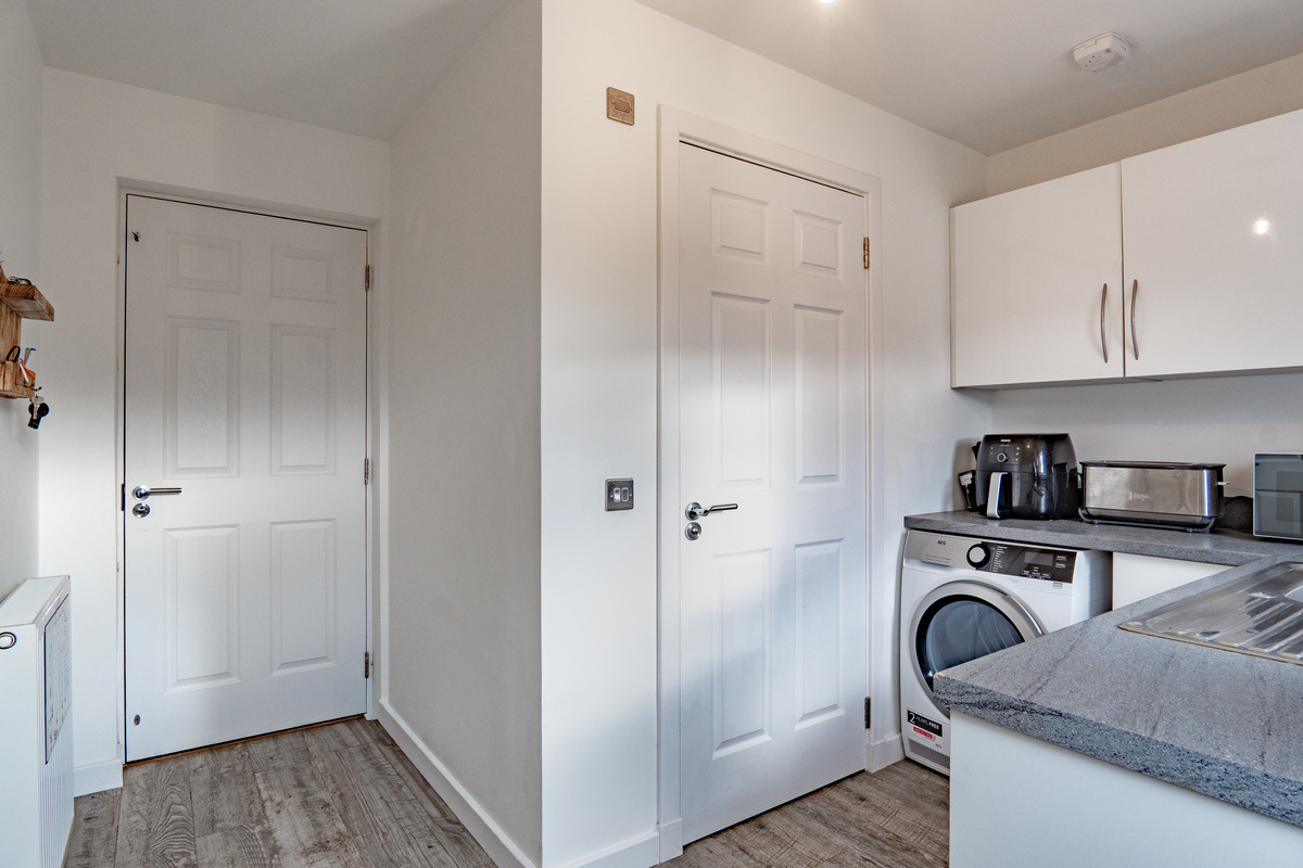 A door from the kitchen leads into the utility room. It’s fitted with matching white cabinets and a grey worktop that ties in with the kitchen’s style. There’s an additional stainless steel sink and space for both a washing machine and tumble dryer, along with room for small appliances or storage. A back door opens directly to the garden, making it easy to hang out laundry with ease.