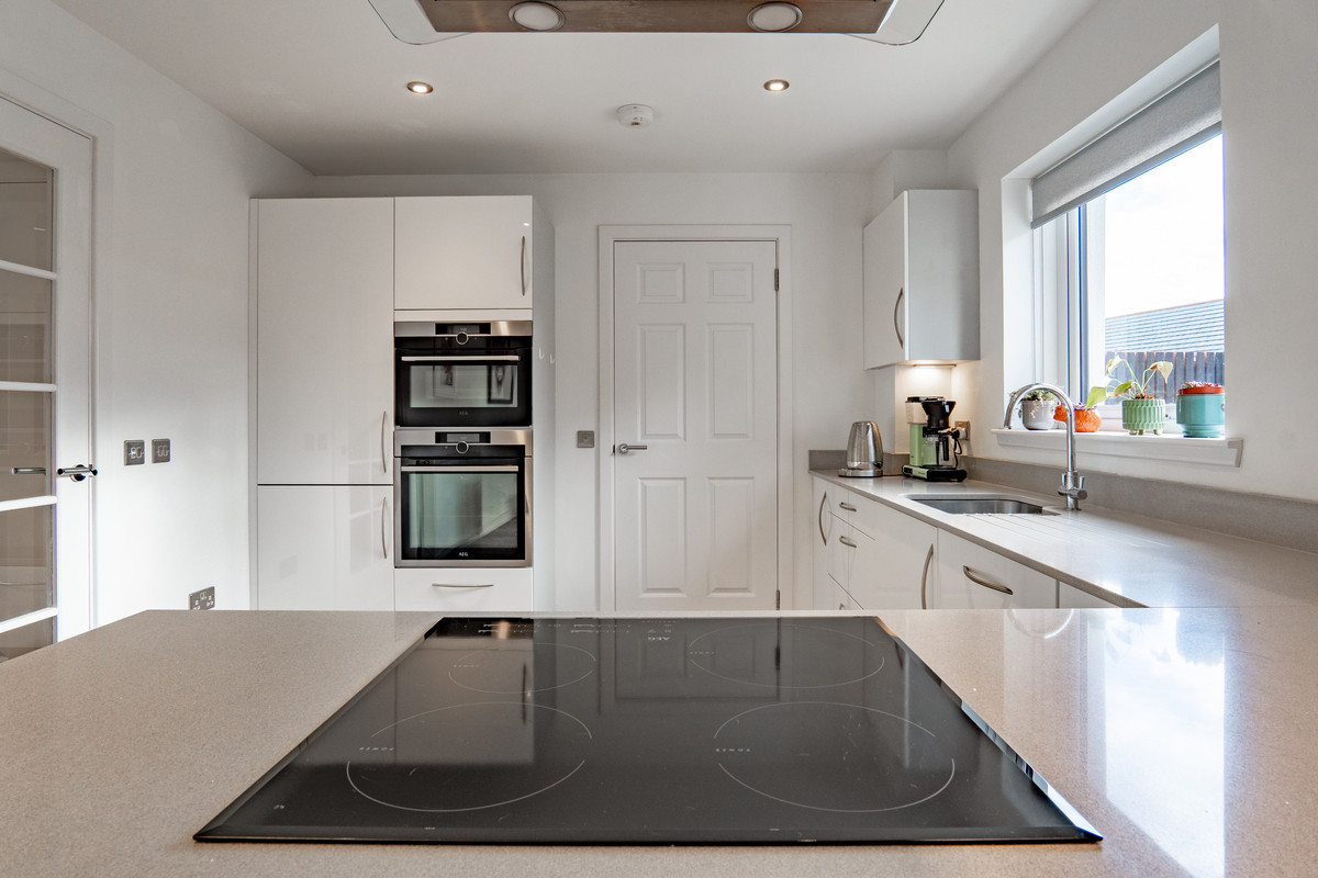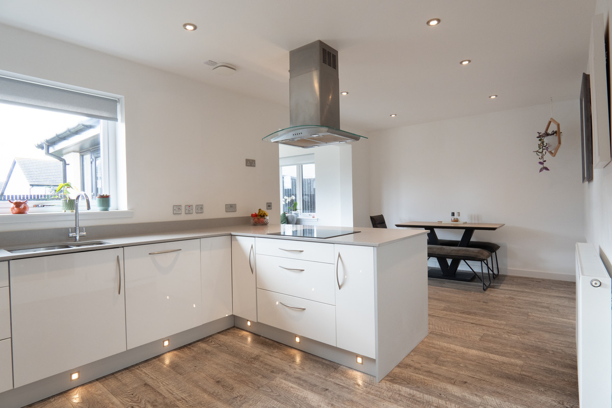 The kitchen and dining area forms the heart of the home, bright, spacious and beautifully finished. The kitchen features sleek white cabinets topped with light grey work surfaces, creating clean lines. Integrated AEG appliances include a double oven built into tall units and a hob set within the worktop, complete with a stylish extractor hood above. Glass fronted cabinets with internal lighting and built-in wine racks add a touch of detail, while kickstrip lighting and ceiling spotlights enhance the modern finish. A large radiator sits between the kitchen and dining spaces, keeping the whole area comfortable. The dining space easily accommodates a family sized table and chairs, making it ideal for relaxed meals or entertaining guests.