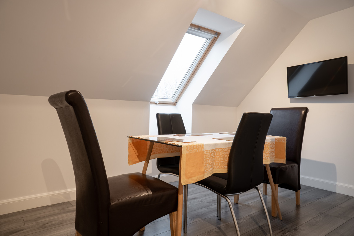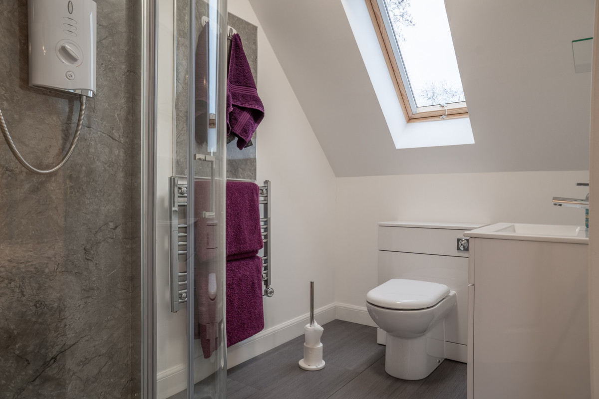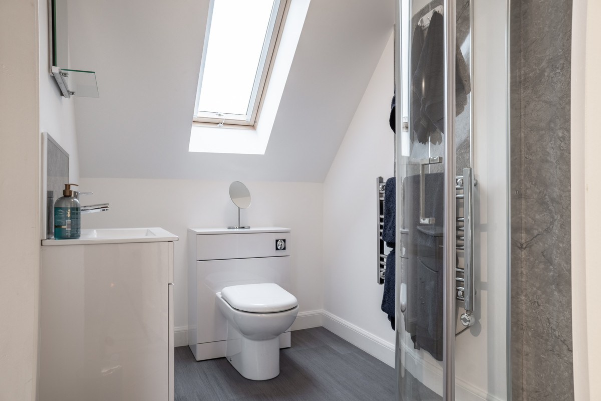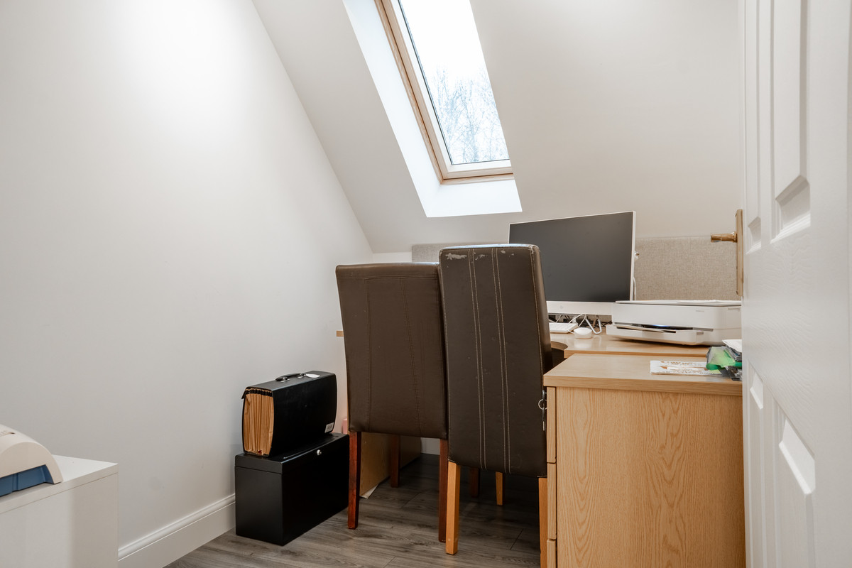 Bedroom four is a spacious double, featuring a cosy reading nook beneath a Velux-style sloping window, creating a peaceful retreat. Its en-suite shower room is sleek and modern, finished with grey wet wall panelling and contemporary fixtures. Bedroom five is another generously sized double, currently housing two single beds and a small built-in cupboard. Like bedroom four, it has a matching en-suite shower room with stylish finishes. Bedroom six is currently set up as an additional dining/lounge space, featuring an electric fire, neutral décor and ample room for furniture. It could easily be converted into another bedroom, a media room or a private study. Bedroom seven, currently used as an office, provides a quiet space for working from home but could also serve as a nursery or compact single room, offering even more versatility to this thoughtfully designed upper level.