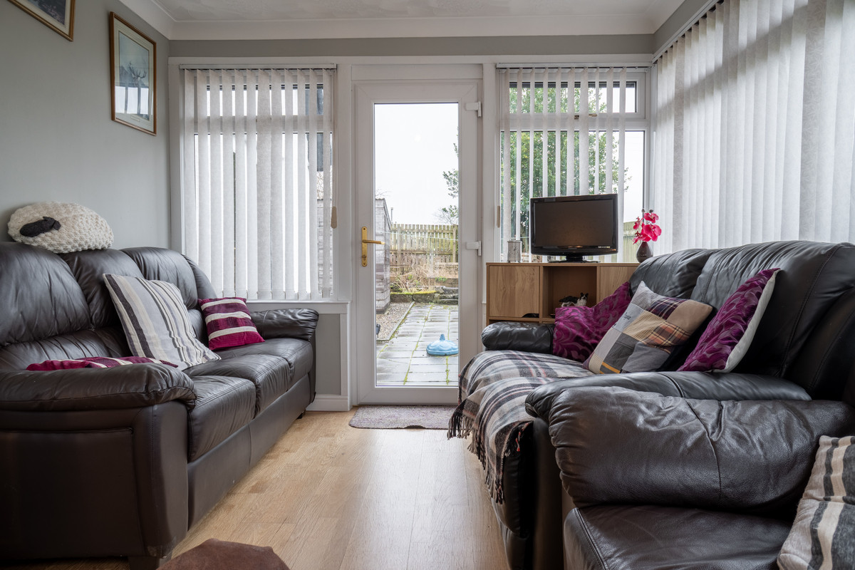 The living room is a true family hub, offering ample space for seating and entertainment. The multi-fuel stove, set within a sleek white fireplace with a grey marble insert, creates a cosy and inviting atmosphere. Large windows flood the room with natural light, while the wood laminate flooring enhances the bright and open feel. Through double doors from the living room, a spacious sunroom awaits, offering a peaceful escape with beautiful garden views. This versatile space is perfect for a relaxing lounge area, a reading nook or even a home office with an inspiring outlook.