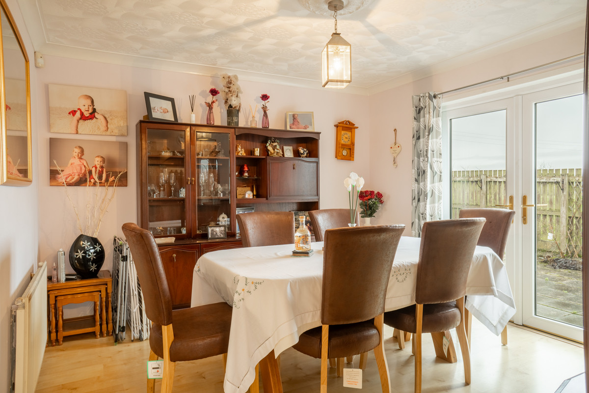 Adjacent to the kitchen, the dining room is perfect for family meals or entertaining guests. This large, well-proportioned space comfortably accommodates a grand dining table and chairs. The French doors open directly to the garden, creating a seamless connection to the outdoors, ideal for summer gatherings and alfresco dining.