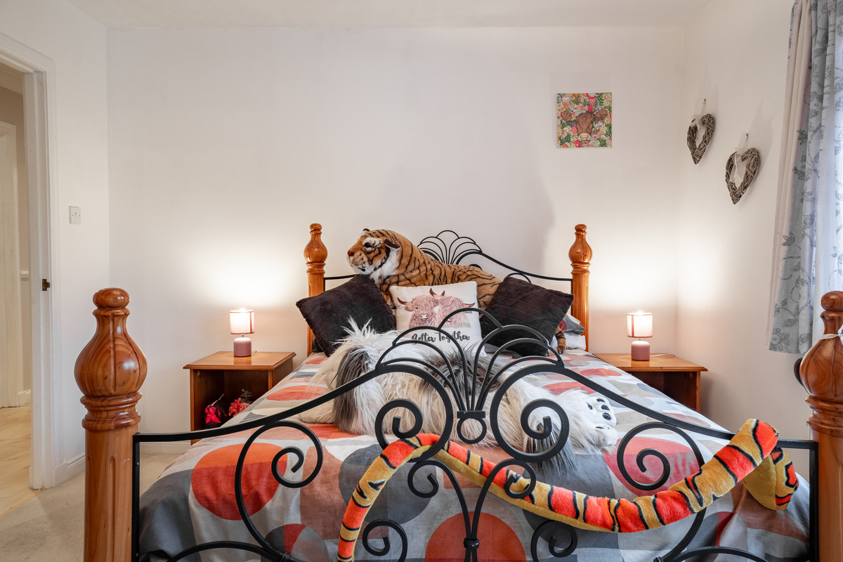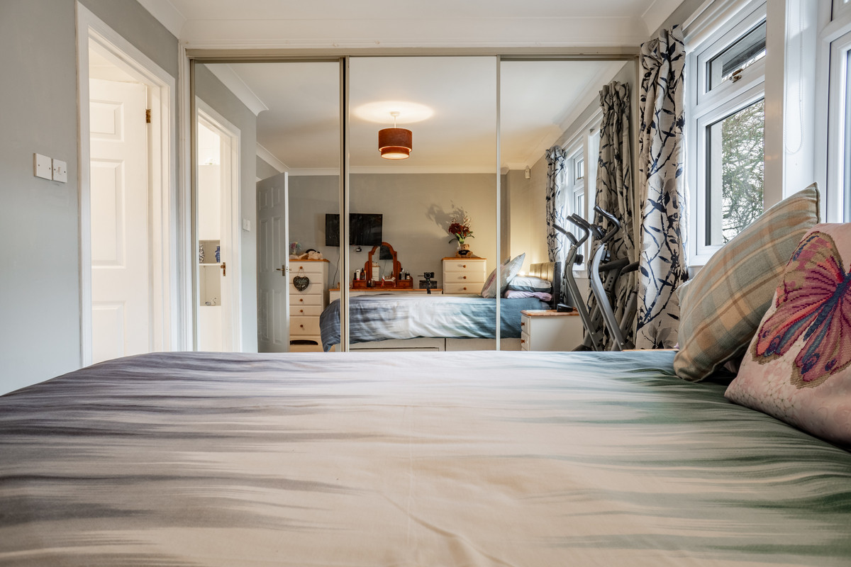 The ground floor hosts three bedrooms, each designed with comfort and practicality in mind. The first serves as a tranquil retreat, featuring a large built-in wardrobe offering ample storage and a cosy carpet for a relaxing atmosphere. The second double bedroom is equally impressive, featuring a mirror-fronted built-in wardrobe for added storage. It also benefits from a private en-suite shower room, elegantly designed with a black-framed shower cubicle and a modern black electric shower. A striking chrome towel rail radiator adds a touch of luxury. The third bedroom, currently set up as a child’s room, adds a playful charm with its space-themed wallpaper on one feature wall, while the neutral décor throughout the rest of the room allows for easy personalization to suit any need.