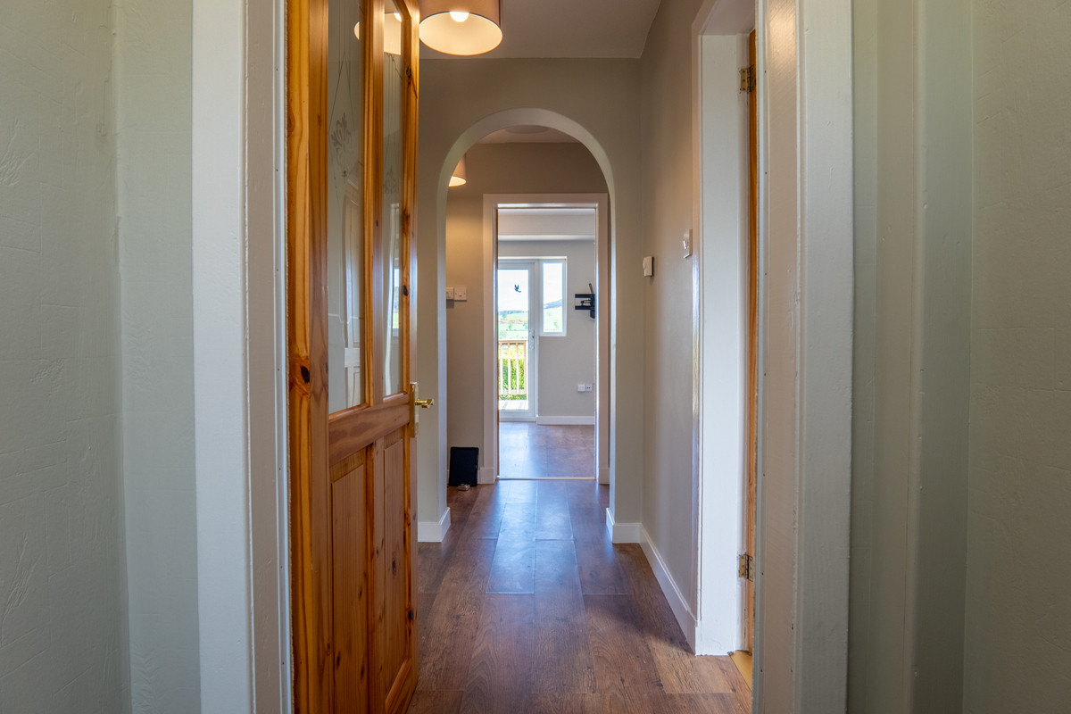 Inside, a bright vestibule opens into a central hallway, providing a welcoming introduction to the property with wooden flooring throughout. Natural wooden doors and a clean, neutral colour palette on the walls provide an attractive contrast between traditional and modern design.