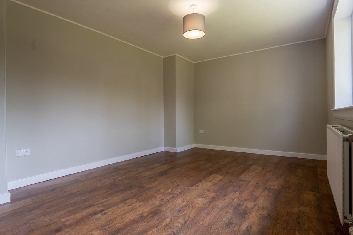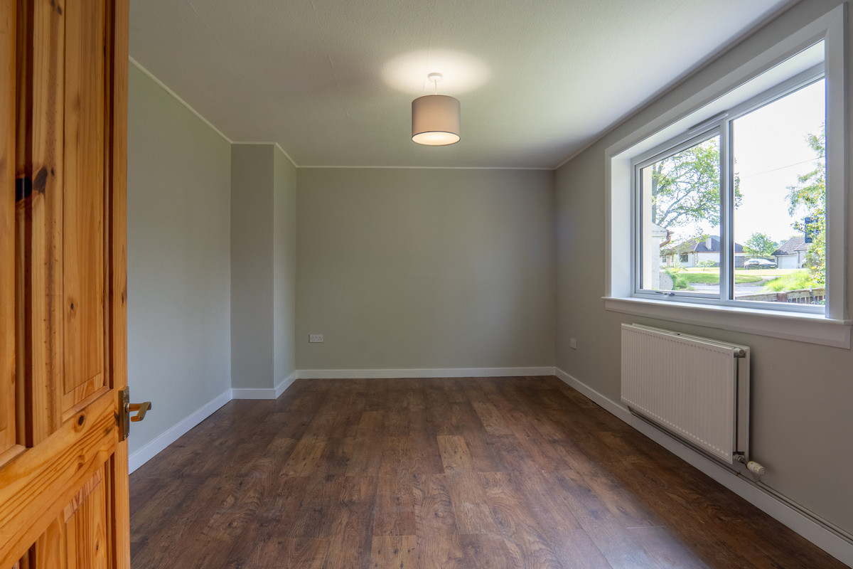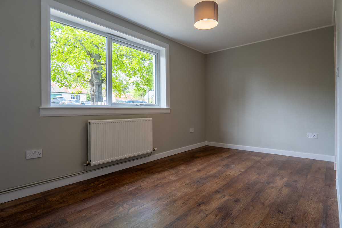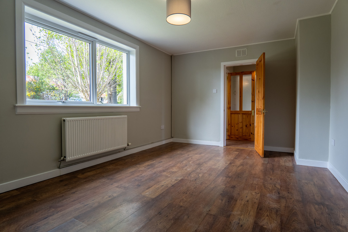 The second bedroom is another spacious double, similarly finished in neutral tones with wooden flooring. A large window draws in plenty of natural light, and the layout allows space for various furnishings. It’s a room ready to be styled to your own taste.