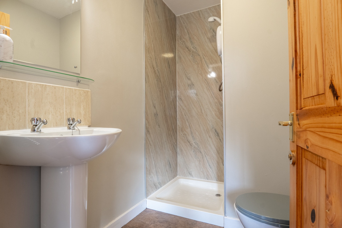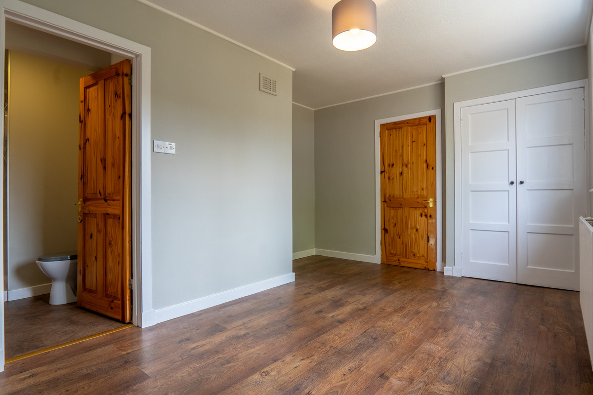 The master bedroom has ample space for a double bed and additional furniture. It’s finished in soft neutral tones with wooden flooring and includes a built-in cupboard and a radiator beneath the window. An en-suite shower room has a tasteful three-piece white-coloured suite of toilet, wash hand basin and shower enclosure with marble-effect wetwalling in the shower and as the basin splashback.
