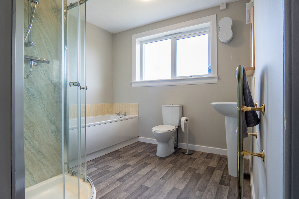 A roomy bathroom contains a four-piece white suite consisting of a full-sized bath, separate shower enclosure, wash-hand basin and toilet with a towel rail and wood-effect flooring. Decorated in neutral tones with a large window to allow natural light, it’s a bright space.