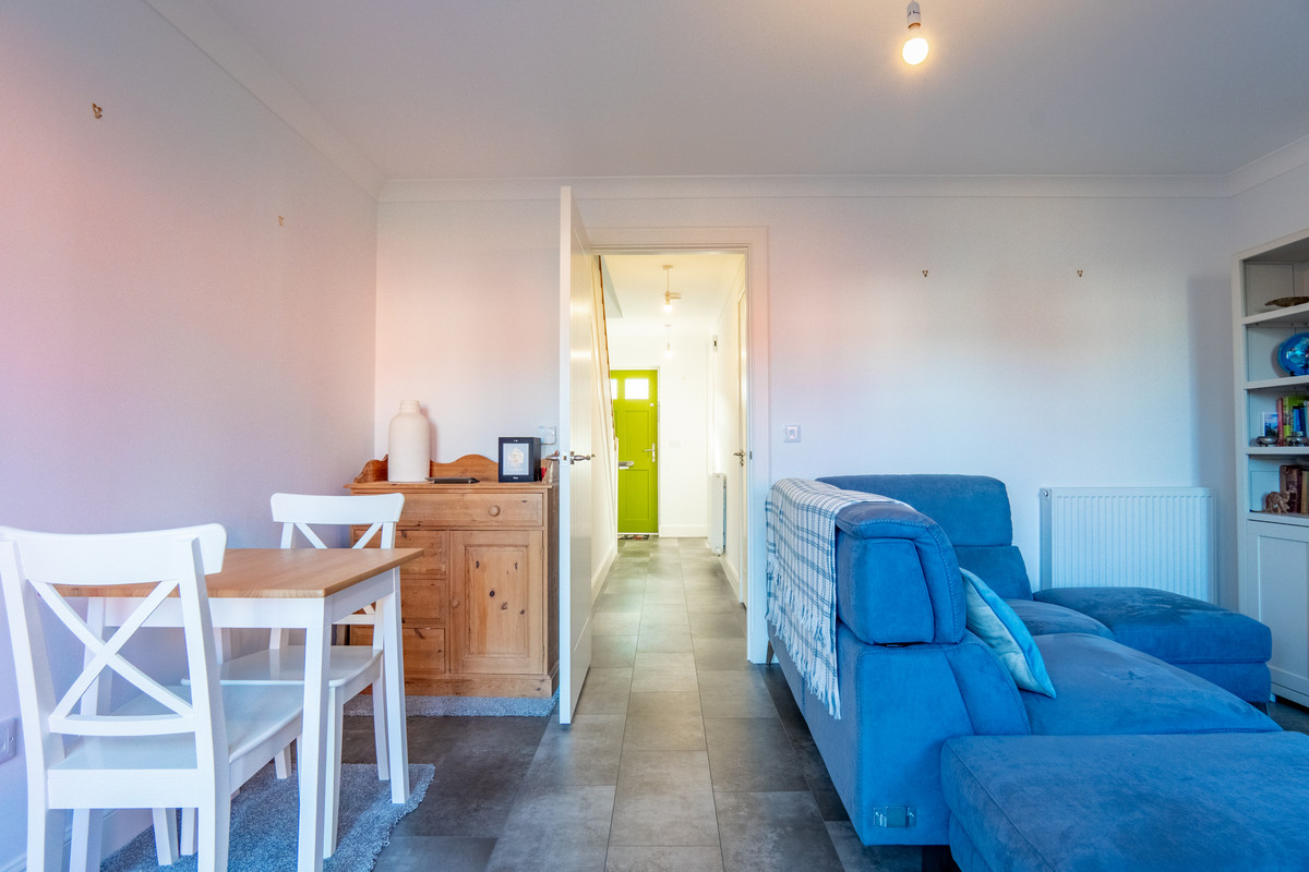 The entrance hall is bright and welcoming, with crisp white walls and internal doors creating a fresh, modern feel. The living room continues the light and airy atmosphere, featuring slate grey tiled flooring and large French doors that open directly to the private rear garden. A window also helps to flood the space with natural light, while a radiator ensures warmth year-round. The room offers space for a comfortable sofa and furniture, with the white walls providing a blank canvas, perfect to a personalised touch.