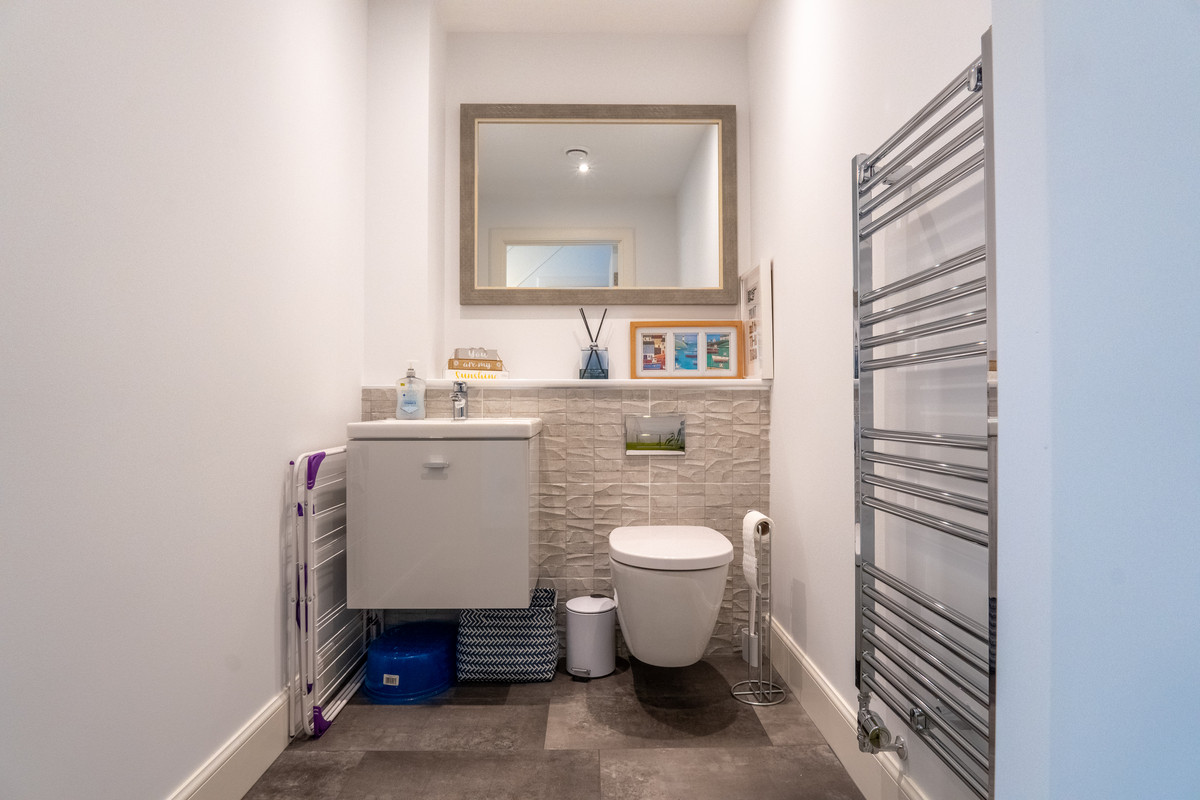 A downstairs toilet offers extra convenience, featuring a sink with built-in storage and a chrome towel radiator. A small shelf provides additional space for toiletries. This well-placed cloackroom is ideal for guests or daytime use.