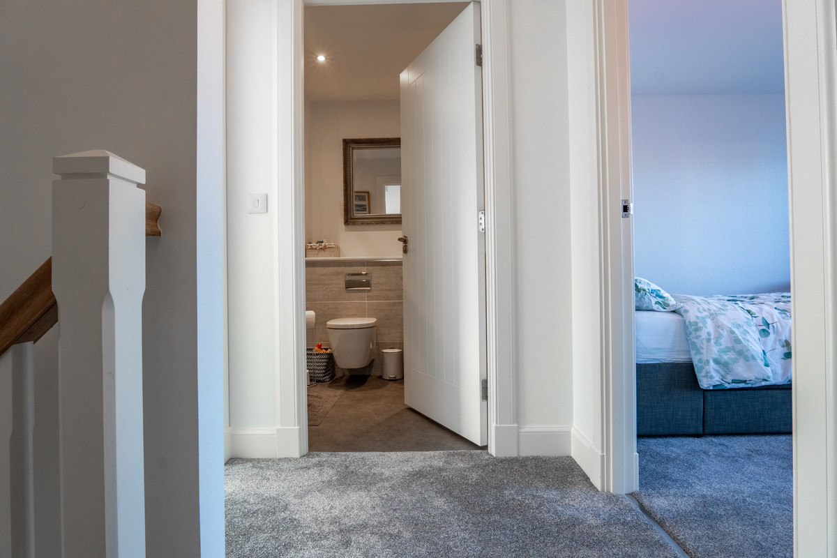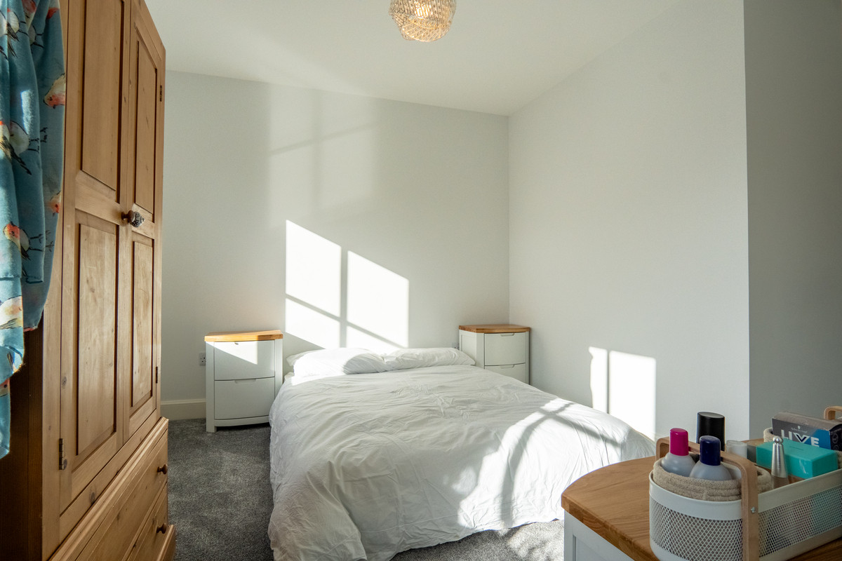 The grey carpeted staircase leads to the first floor landing, where you’ll find the sleeping quarters. Bedroom one is a bright double, finished with soft grey carpet and neutral white walls. A built-in wardrobe with mirrored sliding doors provides ample storage, while small windows and a radiator ensure a cosy yet airy feel.