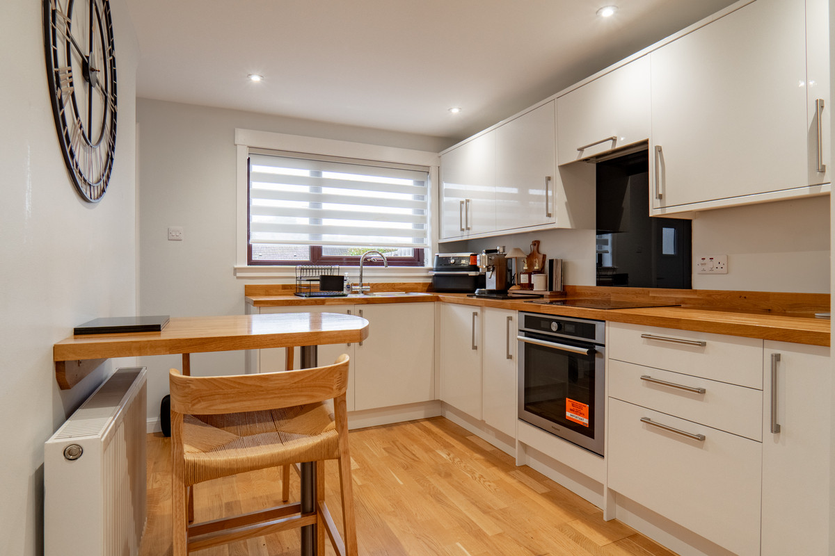 At the rear, the kitchen has been refitted in a smart, modern style with white cabinets topped by solid timber worktops. A stainless steel sink sits beneath the window, while an integrated oven with electric hob above is set into the run of counters. A small breakfast bar on the opposite wall creates a casual spot to sit, complemented by a radiator beneath. Wooden flooring continues here, with ceiling spotlights overhead and a rear door that provides direct access to the garden.