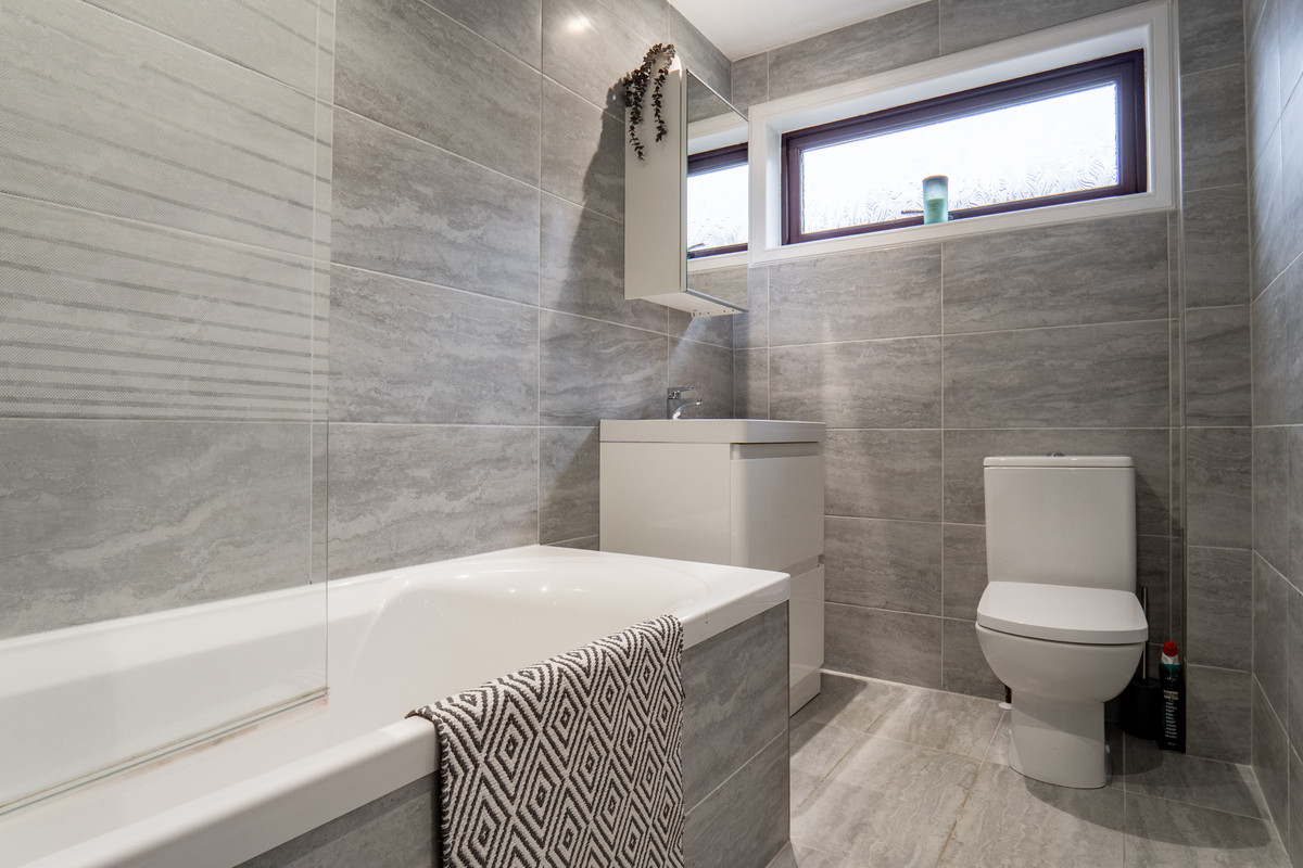 Also on the ground floor is the bathroom, styled in a sleek and contemporary finish. Large grey tiles line the walls and floor, setting a stylish contrast against the white suite. The bath is fitted with a rainfall showerhead above and a glass screen to the side. A small vanity unit with the sink sat on top contains drawers beneath providing storage. A tall chrome towel radiator completes the room, while a wide high window brings in natural light.