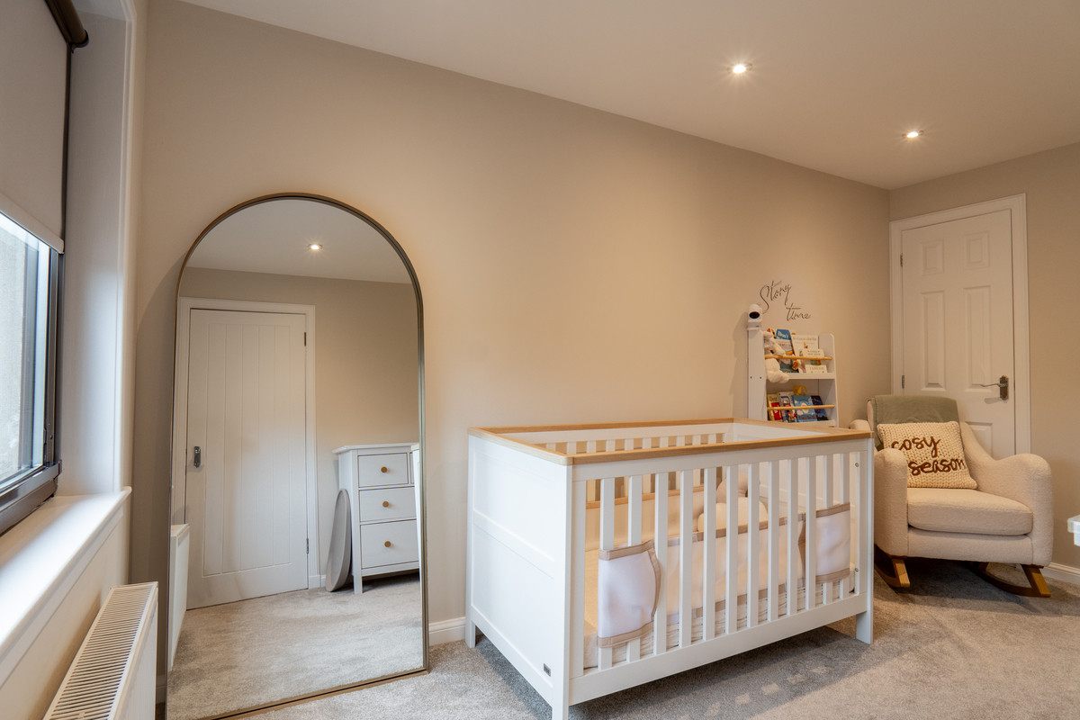 The second bedroom is slightly smaller, decorated in light grey with a matching soft carpet. A built-in wardrobe with mirrored sliding doors offers practical storage while leaving ample room for furnishings. Ceiling spotlights keep the room bright and modern, making it a versatile space for family, guests or even a home office.