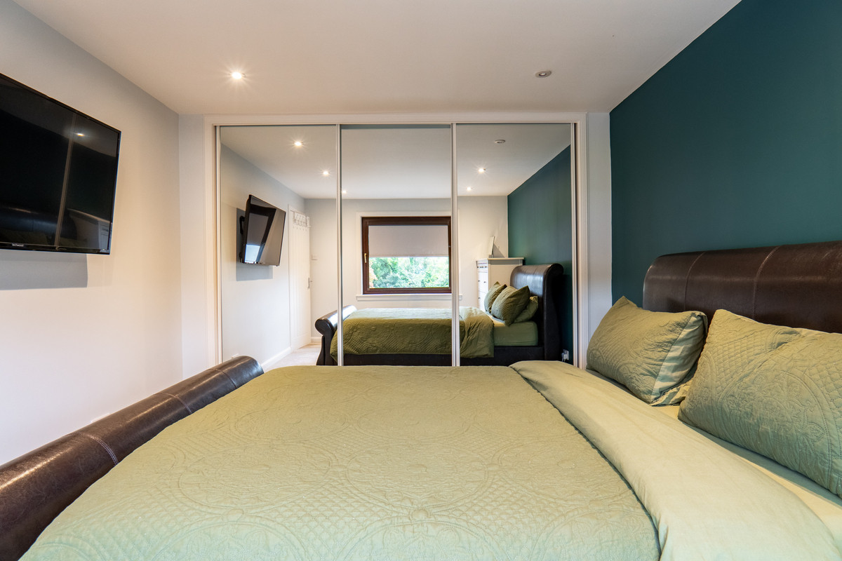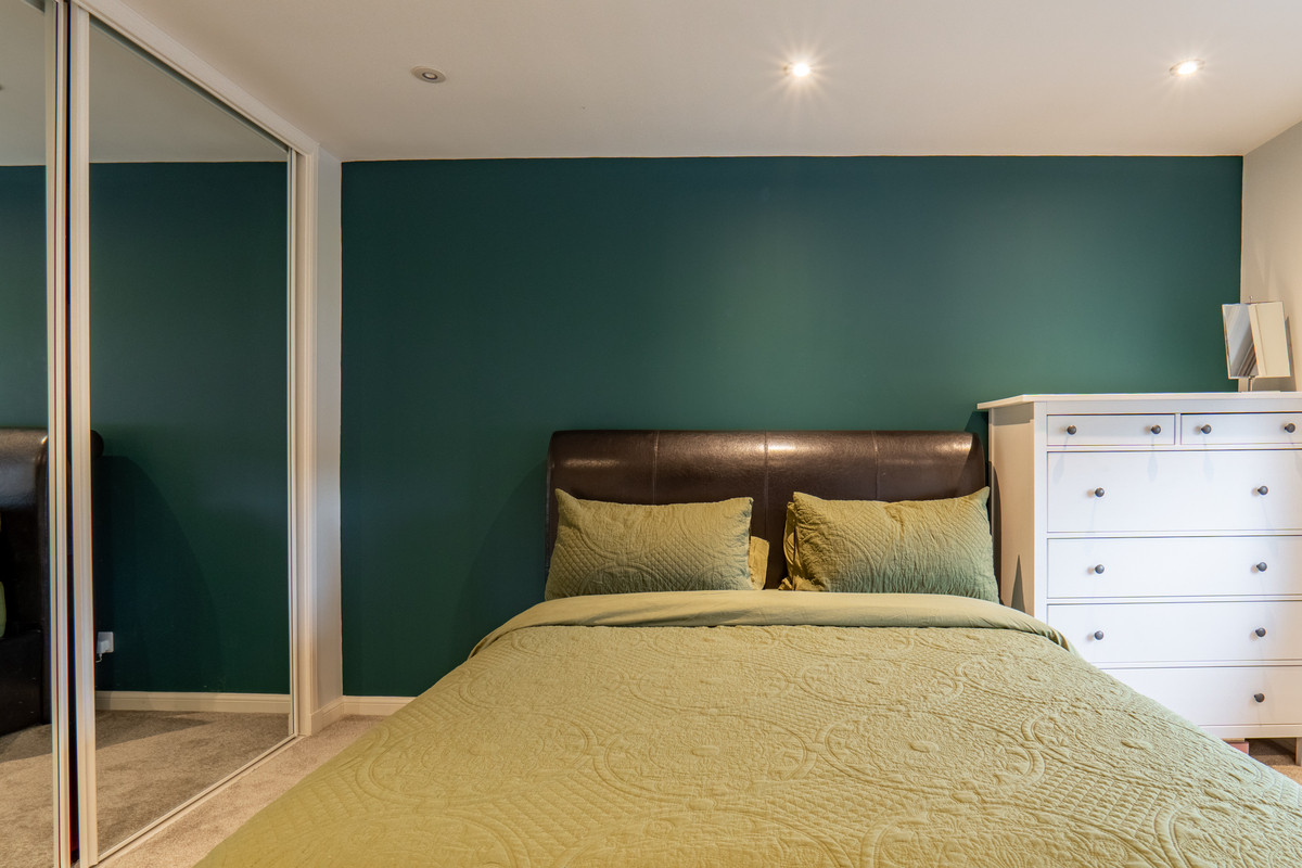 From the hall, a staircase rises to the upper floor where two double bedrooms are located. The main bedroom is generous in size and features a striking dark green feature wall that adds depth to the decor. A triple wardrobe with mirrored sliding doors spans one side, providing excellent storage. A window with radiator beneath ensures light and warmth, while the soft grey carpet ties the room together.