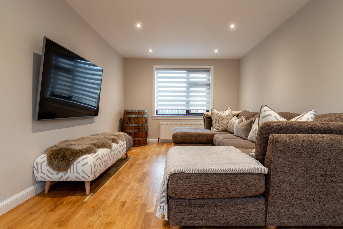 Running the full depth of the home, the sitting room is a spacious, versatile area that benefits from natural light through windows to both the front and rear. Light grey walls and wooden flooring keep the look modern and fresh, while ceiling spotlights add to the contemporary feel. Radiators beneath each window ensure warmth throughout while the proportions of the room allow for a full sofa suite with room left over for a dining table at one end if desired.