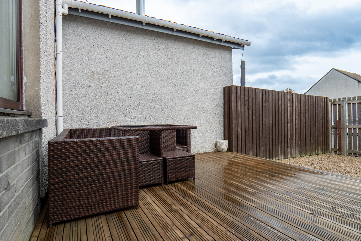 Outside, the front garden is mainly laid to grass with a paved path and a section of decorative stone chips. The rear garden offers a good balance of space and easy maintenance, with a large decked area creating the perfect spot to sit out, relax or host a barbecue. The remainder is finished with gravel. Here you’ll also find a solid roughcast shed with a metal sheet roof, giving secure storage for tools or outdoor equipment.
