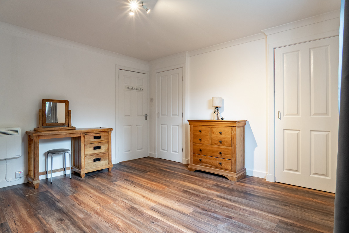 The second bedroom is reached directly from the living room and continues the same simple, modern style. The dark wood flooring continues in here, providing contrast to the clean white walls. A window brings in natural light, while the wall mounted electric heater keeps the room warm. It’s a flexible room that could serve as a guest bedroom, child’s room or even a home office if preferred.