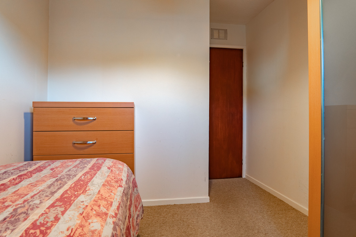 The second bedroom is finished with soft cream walls and natural wood finishes that give it a warm, understated feel. It’s ideal for a single bed, office or hobby setup, and is a straightforward, comfortable space that’s ready to use.
