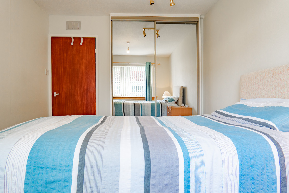 The main bedroom is bright and inviting, with cream coloured walls that keep the space feeling calm. A large window draws in daylight while mirrored sliding wardrobes stretch across one wall, offering useful storage and helping the room feel even more spacious. It’s a comfortable double room that feels instantly restful and easy to make your own.