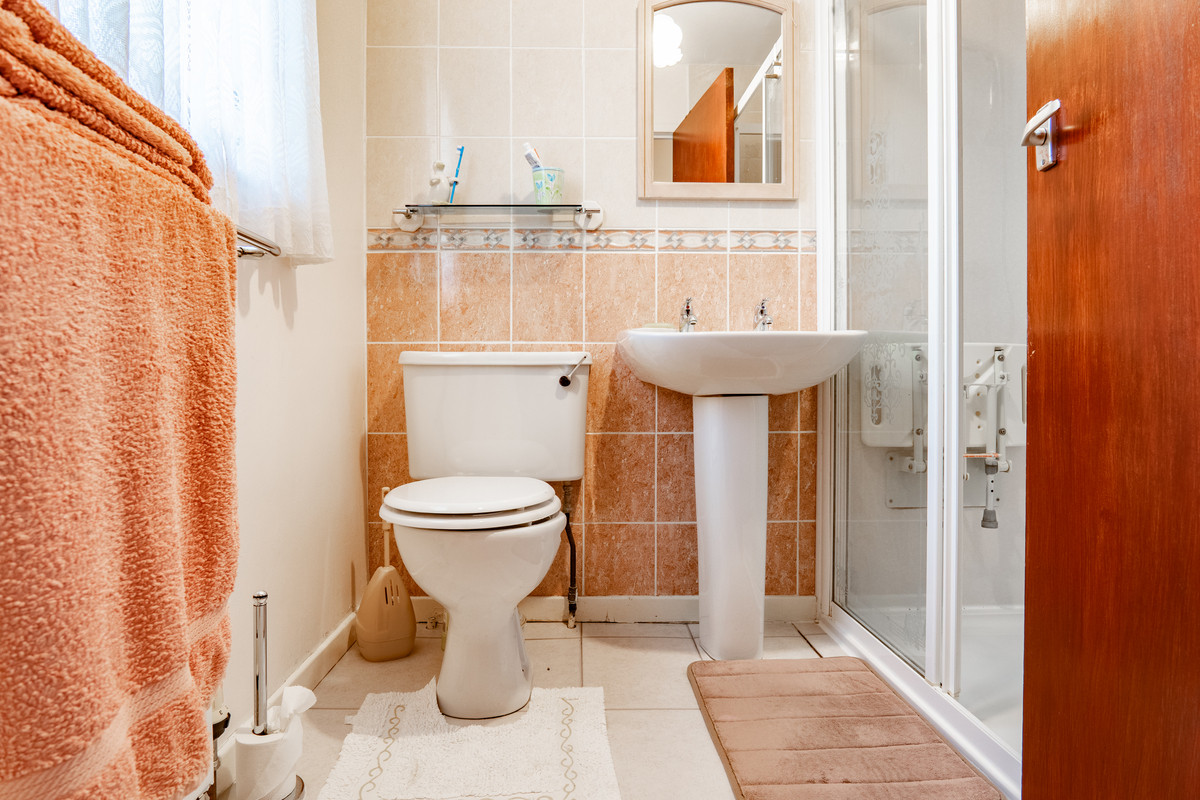 The shower room features a white suite with a pedestal basin, toilet and enclosed mixer shower. The walls are tiled halfway in a warm terracotta shade, topped with lighter cream tiles and a decorative patterned border. A frosted window brings in natural light while maintaining privacy, giving this space a practical yet comfortable feel.