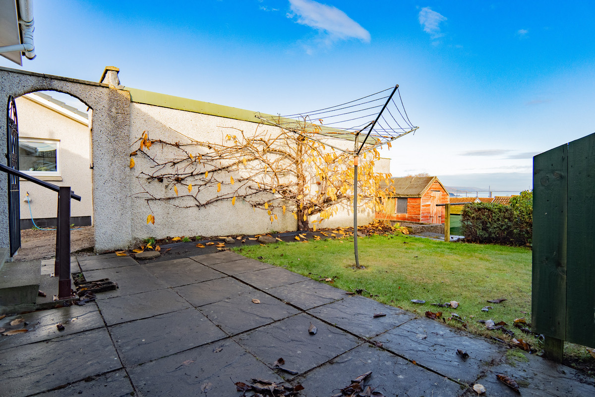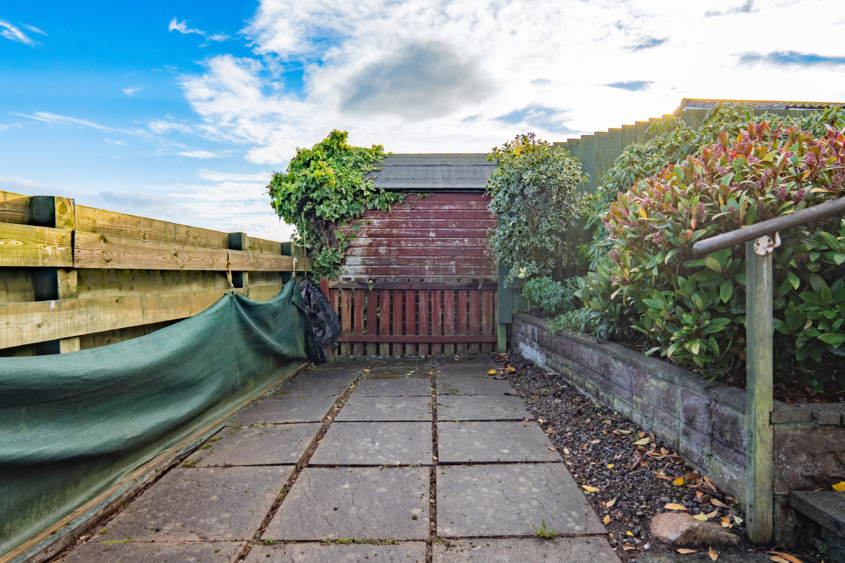 The gardens wrap neatly around the home, with grassed areas to the front and rear and paved sections that make maintenance straightforward. A low retaining wall and timber fencing define the space, giving it a tidy, enclosed feel. To one side, a driveway provides off street parking and leads to a single garage, built in block with a concrete floor and power supply. A timber shed sits at the rear, offering extra storage for tools or garden equipment, practical touches that make daily life that bit easier.