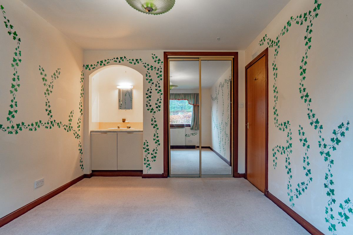 Back up on the main level, the first bedroom sits along the hallway and has a simple layout. Light walls and a soft carpet keep it calm while a wide window looks out towards the trees. Along one wall, a full height mirrored wardrobe gives you practical storage. Just beside it, an arched alcove holds a built-in sink with a cupboard underneath, which is handy for getting ready without needing the main bathroom.