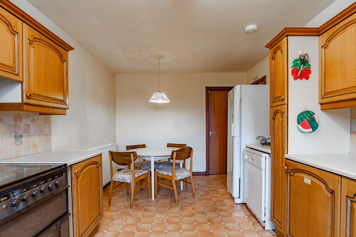The kitchen and dining room share one long, practical space with plenty of storage on both sides. The units are finished in a wooden style, paired with cream worktops and a tiled splashback in soft neutral tones. The sink sits beneath the main window at the far end. A freestanding cooker is set into the right hand run, with storage around it, while a dishwasher and a tall cupboard sit to the left. The patterned vinyl floor ties the whole room together. At the dining end, there’s space for a table and chairs beside a radiator, with a simple pendant light above. A door here leads through to the utility and WC, keeping everything easy to move between.