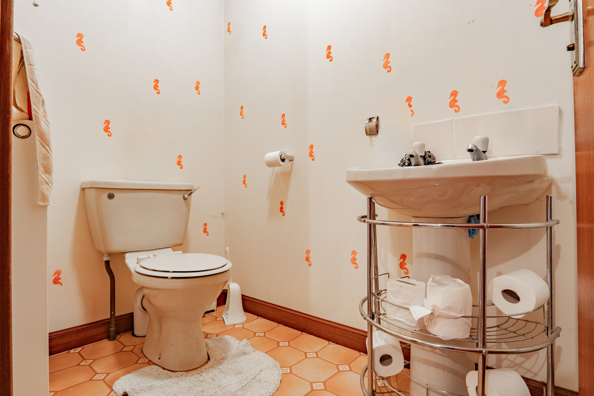 The WC sits just off the utility area beside the stairs. It’s fitted with a toilet and a pedestal basin. The decor is simple, with cream walls patterned with small seahorse motifs and the same tiled flooring used in the utility space. It’s a practical little room and keeps the main bathroom free for the rest of the household.