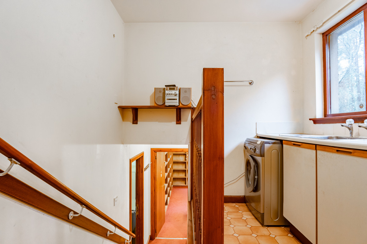 The utility room sits just off the kitchen and provides a handy extra workspace. There’s a run of base units with a stainless steel sink set beneath a window, along with space and plumbing for laundry appliances. The same patterned vinyl flooring continues through here, tying it in with the kitchen. A simple wall rail offers a spot for towels, and there’s an open balustrade along the inner side where the staircase leads down to the lower level. It’s a practical area for day-to-day jobs and keeps the main kitchen free from clutter.