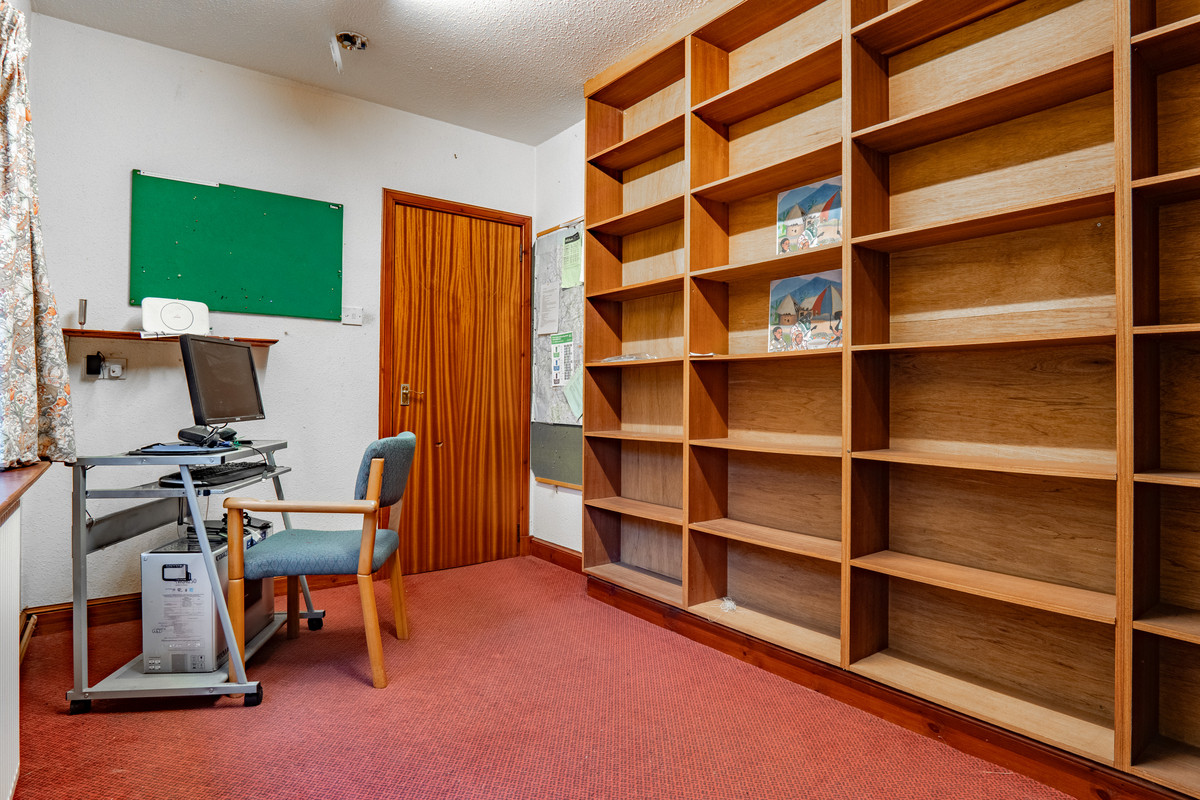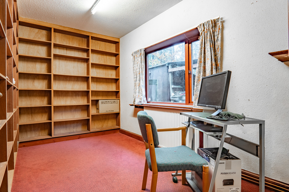 The stairs from the utility area lead down to a lower ground floor where you’ll find a flexible room currently set up as an office. It’s a practical space with fitted shelving running along two walls, giving you plenty of storage. A wide window sits above the radiator on the exterior wall, bringing in daylight and offering a view out to the side of the property. The decor is simple, with painted walls and the same carpet as the hallway above, making the room easy to personalise. There’s enough floor space for a desk, chair and additional storage with the layout working just as well as a quiet study, a craft room or an occasional fourth bedroom if needed.