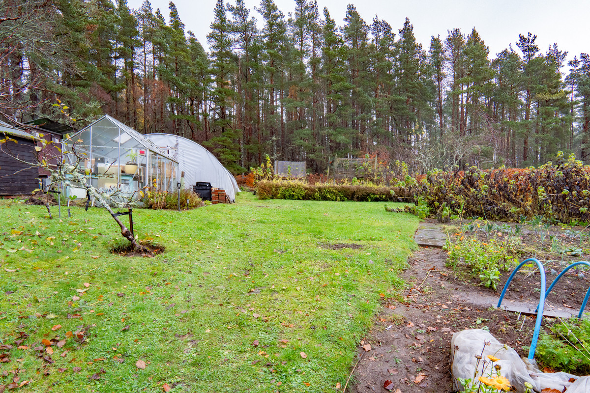 The gardens offer plenty of usable outdoor space, with a mix of lawn, gravelled areas and simple paved paths around the house. Beds of shrubs and established planting sit alongside several productive vegetable patches, giving the plot a practical feel for anyone who enjoys growing their own. The boundaries are mostly formed by timber post and wire fencing and there are multiple outbuildings dotted around the grounds, including a handful of timber sheds, a glass greenhouse and a large polytunnel.