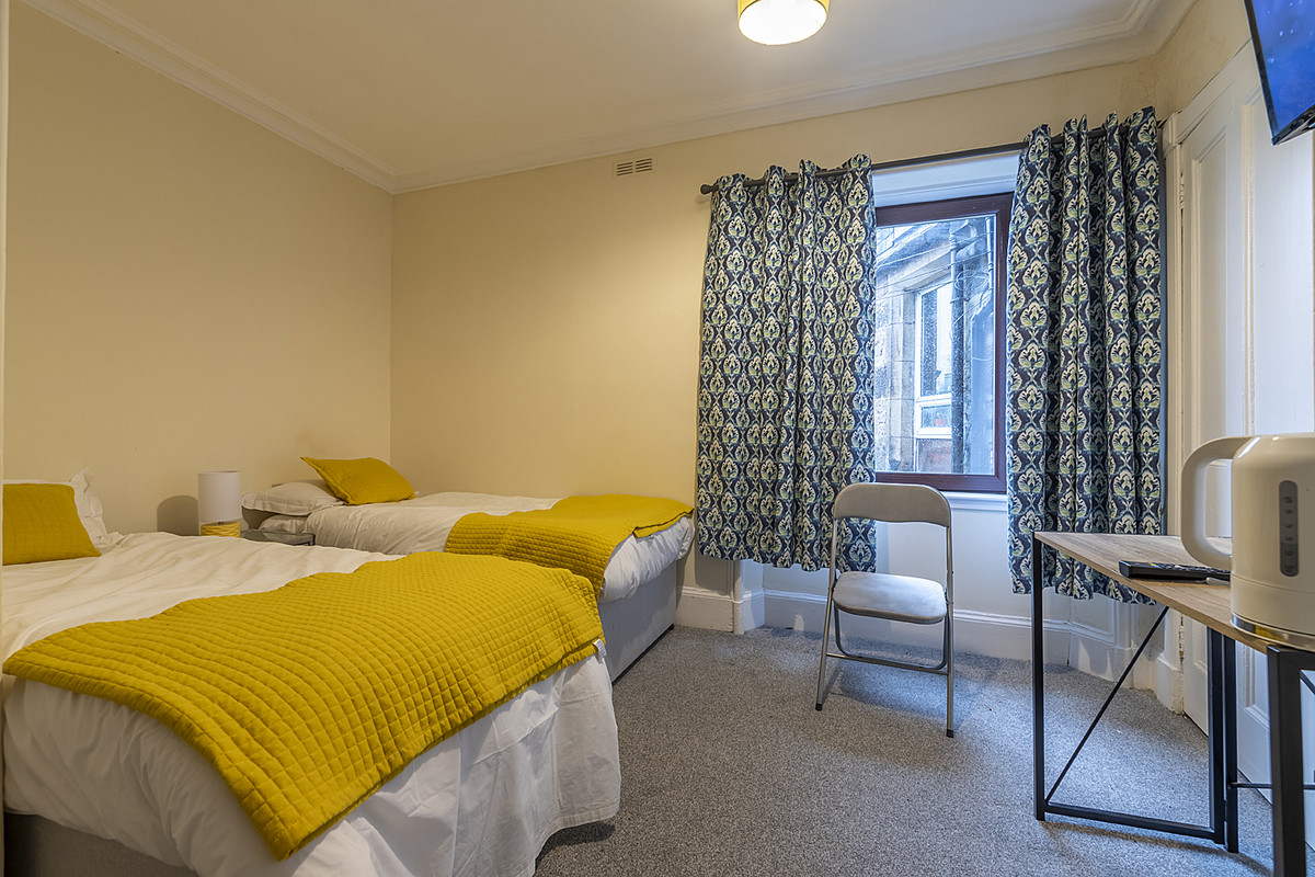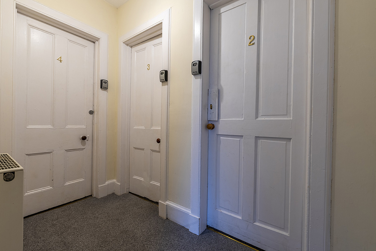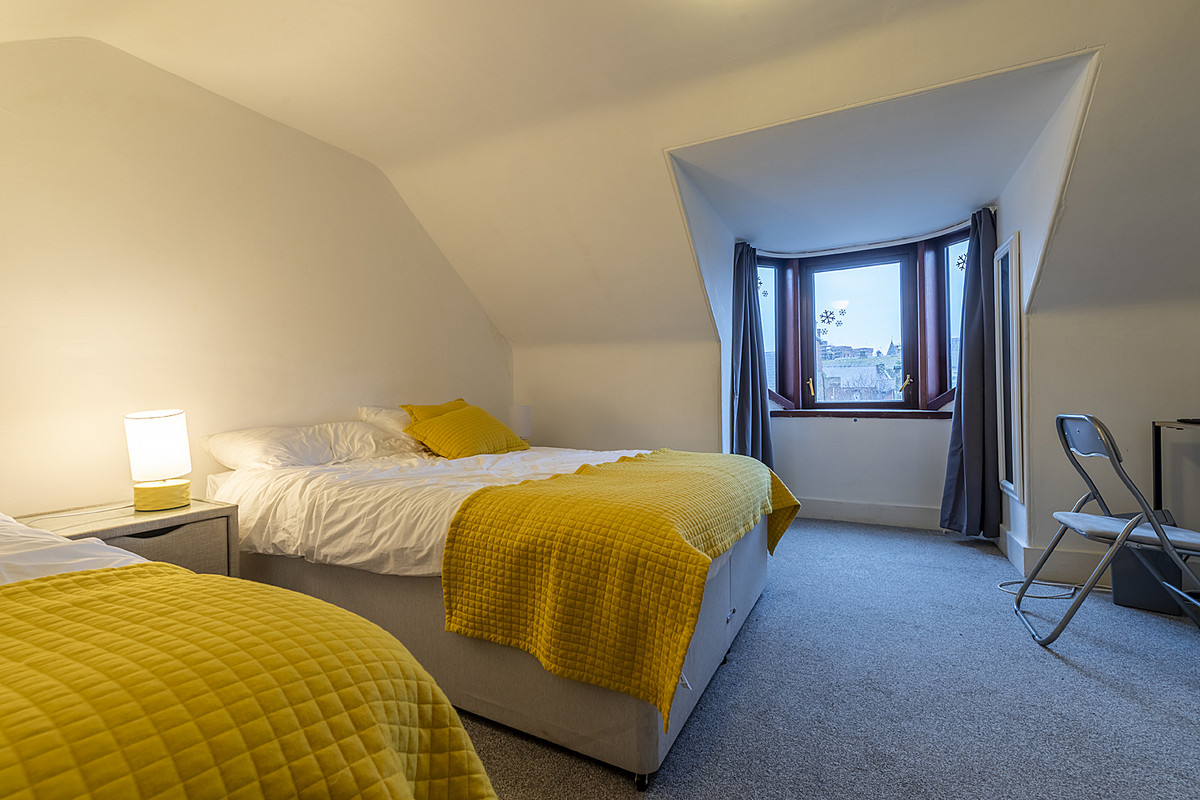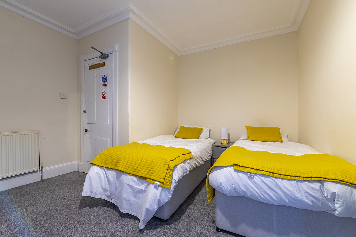 Upstairs on the first floor, you’ll find three generously sized bedrooms, each offering a similar level of space and versatility. All three rooms are well-proportioned, with cream walls and soft carpeting creating a cohesive and comfortable feel. One bedroom is currently arranged with a double bed, another with a double and single bed, and the third with two single beds and a built-in wardrobe for added storage, showcasing the flexibility these rooms provide.