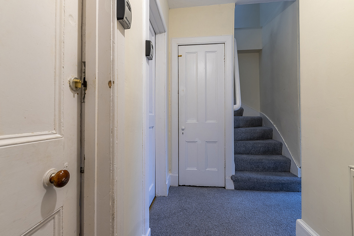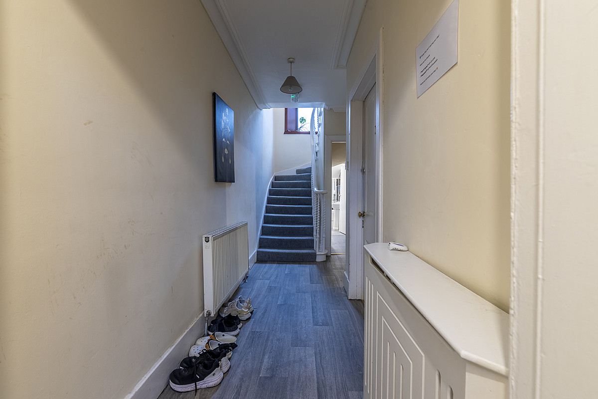 Entering through the PVC double-glazed front door, you’re welcomed by a bright entrance hallway with wood laminate flooring, cream-painted walls and a large radiator to keep the space warm and inviting. Straight ahead lies a carpeted staircase that gracefully turns back on itself, leading to the upper levels.
