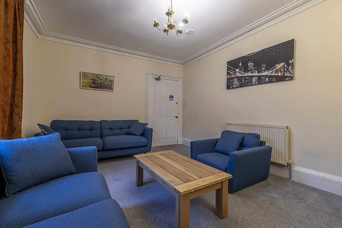 To the right, the spacious sitting room exudes comfort and character, featuring cream walls, a light grey carpet and a marble fireplace with a decorative gas fire as the centrepiece. An alcove to the right of this adds practicality with a decorative shelf while tall ceilings and a large front-facing window flood the room with natural light.