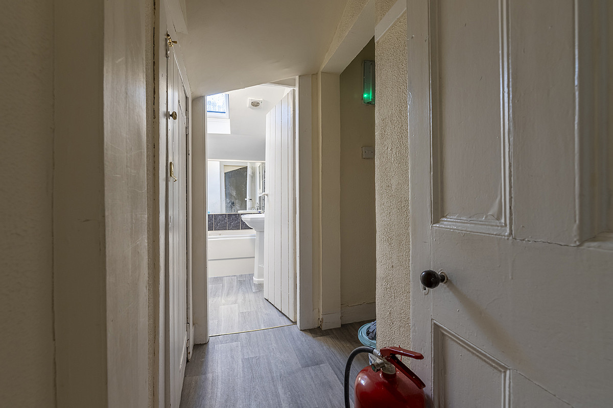 The attic floor offers a private retreat, with a carpeted staircase leading to a large fourth bedroom featuring sloping ceilings and a dormer window that fills the room with light. This room comfortably accommodates a double bed and additional furnishings, making it a versatile space. The adjacent shower room includes a modern shower cubicle, an electric shower and a chrome towel radiator, providing convenience and style.