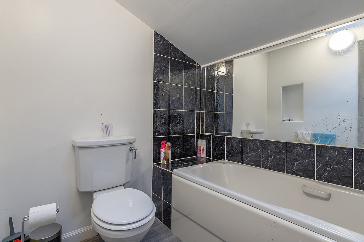 The ground-floor bathroom continues the home’s tasteful theme, featuring striking black tiling around the bath with a large mirror above. The traditional-style bath and sink complement the cream-painted walls, creating a timeless and relaxing atmosphere.