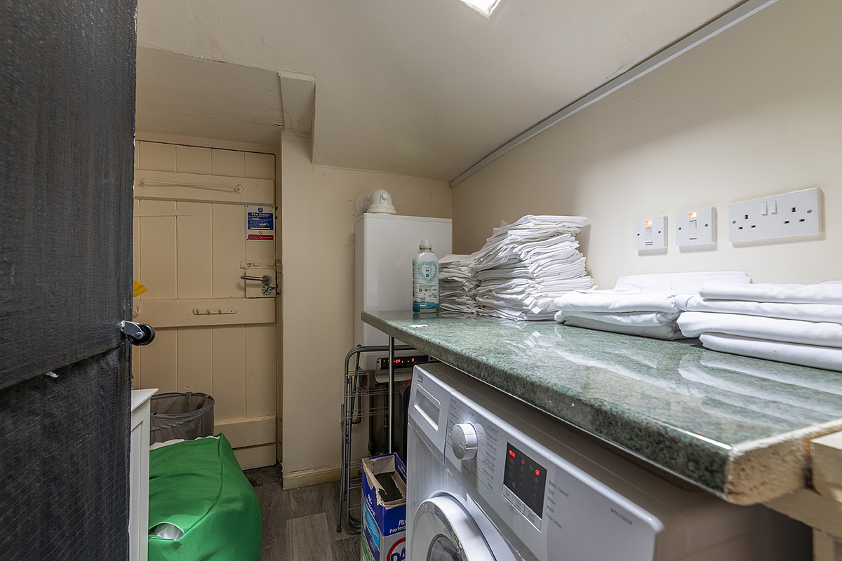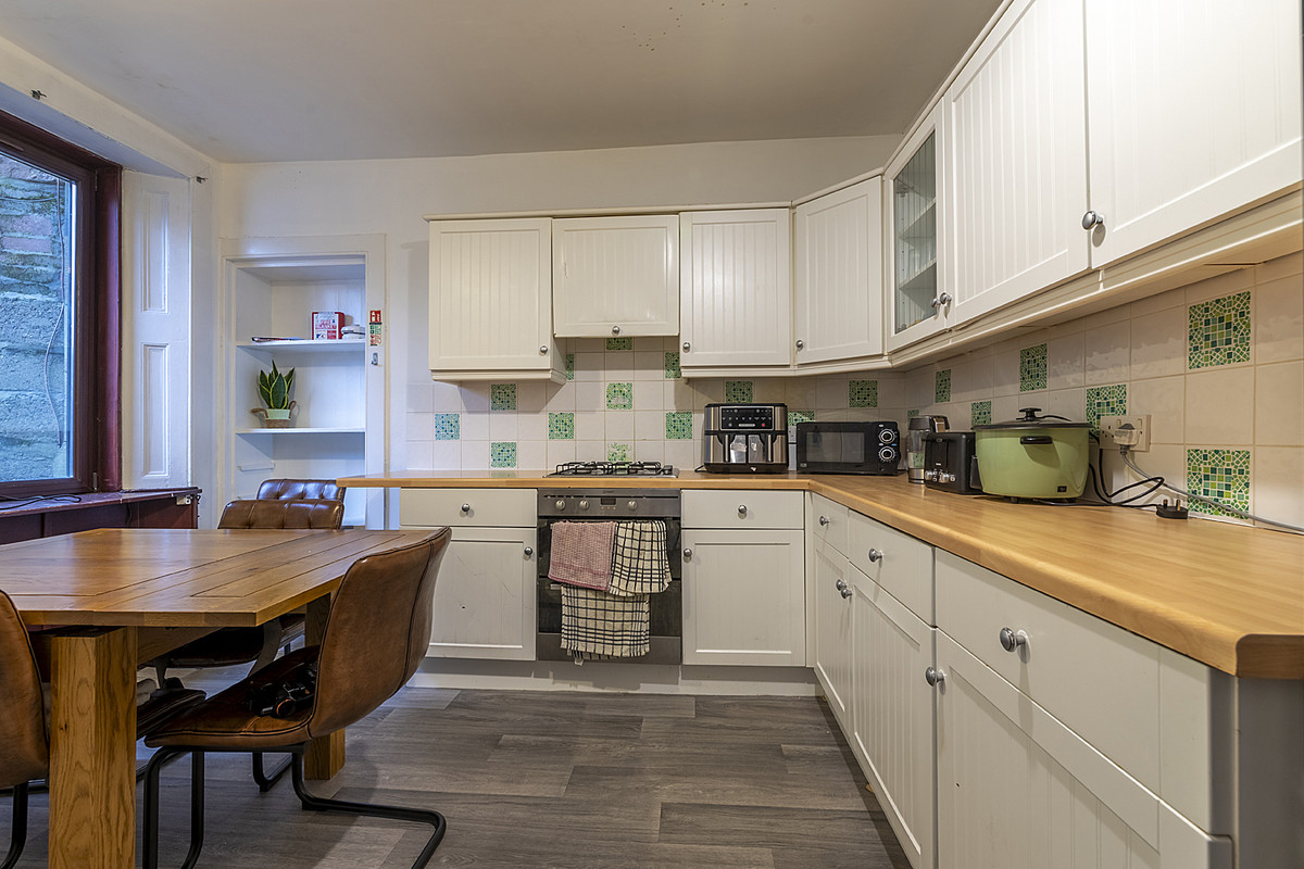 The kitchen/dining room is a well-laid-out space featuring light coloured cabinets, wooden worktops and white tiling accented by patterned green tiles. Integrated appliances, including an oven and hob, enhance functionality. There’s ample space for a dining table and chairs, making it perfect for both everyday meals and entertaining. All the hall from the kitchen, the utility room is a handy addition, providing extra storage and room for laundry appliances, ensuring a clutter-free living space.