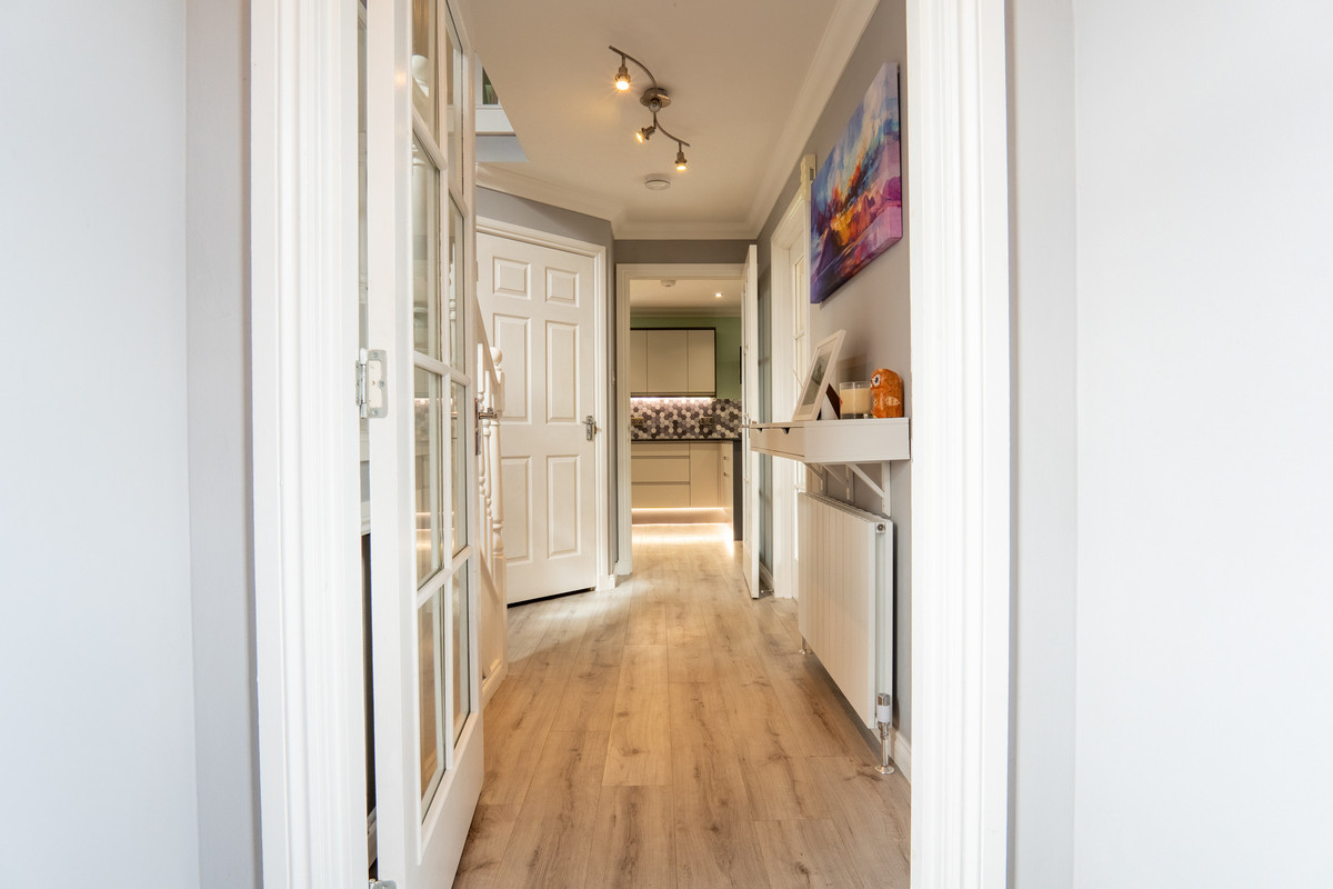 The entrance vestibule opens into a bright hallway finished with a light grey paint scheme and white skirting, cornicing and internal doors. The light-toned laminate flooring flows throughout the ground floor, providing a cohesive and contemporary look. To the front of the home, the living room is a large and welcoming space with a broad window overlooking the street. Decorated in light neutrals with a warm wood-toned floor, the room offers ample space for sofas and furniture, with a tall white radiator placed neatly by the door.