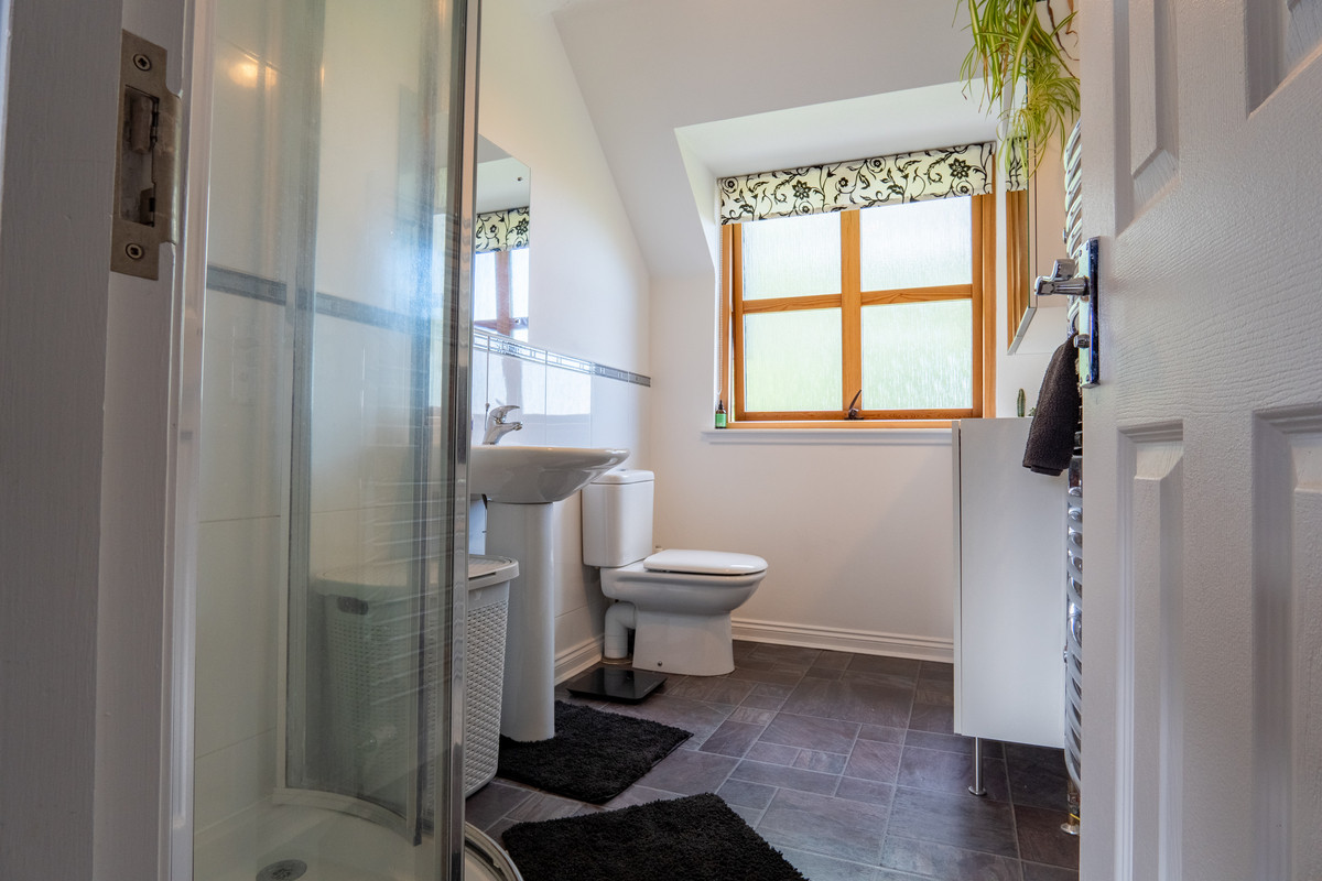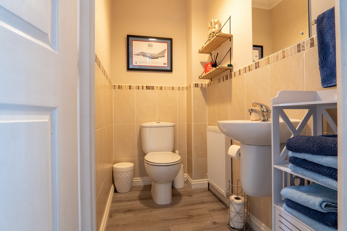 A set of French doors open directly from the dining space into the conservatory. This extension has been thoughtfully designed with an insulated and PVC-lined roof, providing year-round usability. Surrounded by double-glazed windows and set on a concrete base, the room is bright and spacious with views across the garden. A set of glazed doors leads out to the rear patio. Accessed from the kitchen, the utility room continues the kitchen design with matching units, grey worktops and matching splashbacks. There is a built-in microwave and room for additional appliances. This room also includes internal access to the garage. The home also benefits from a ground floor toilet, located off the hall. This features cream wall tiling, and includes a white toilet and hand basin.