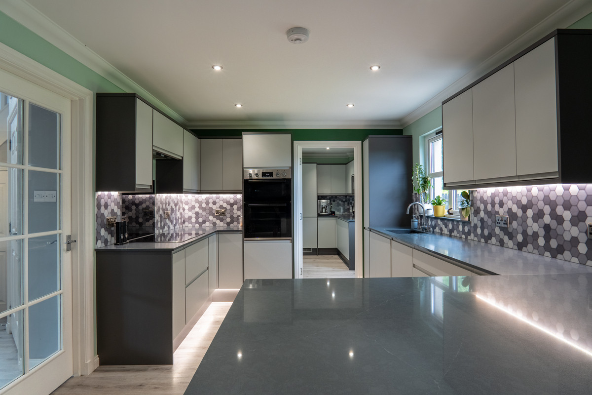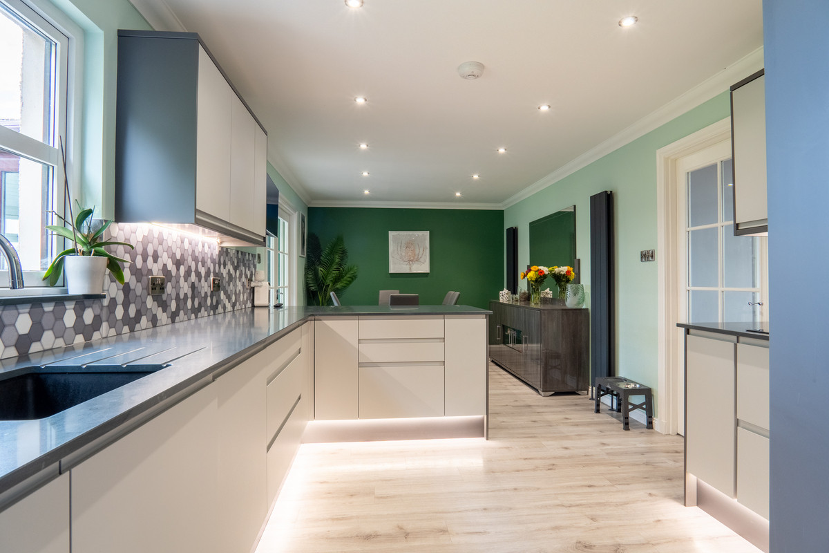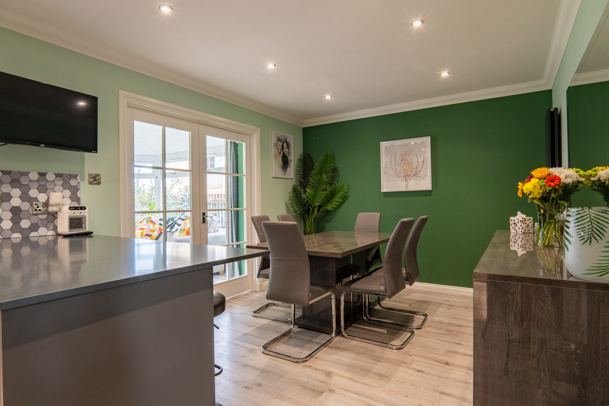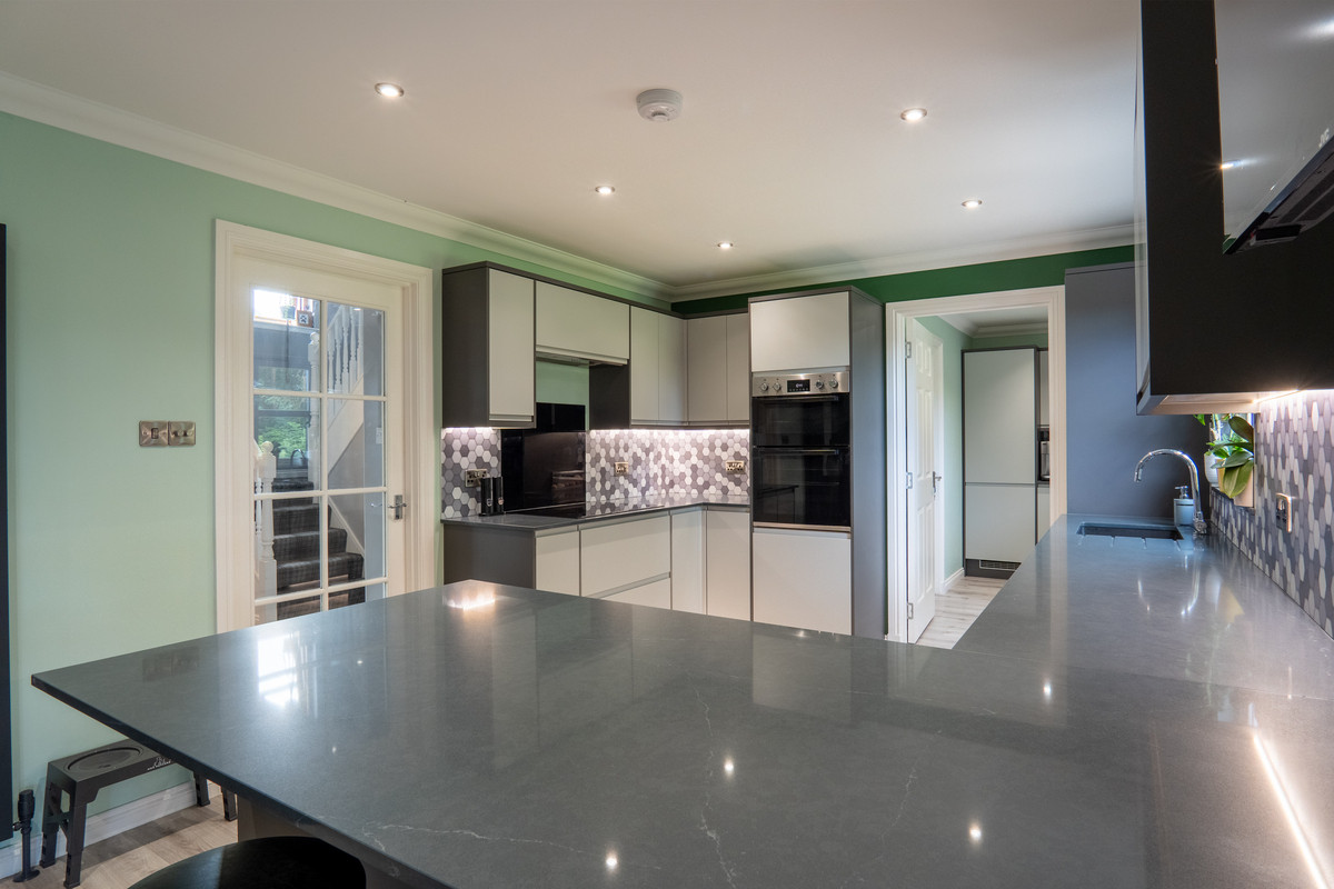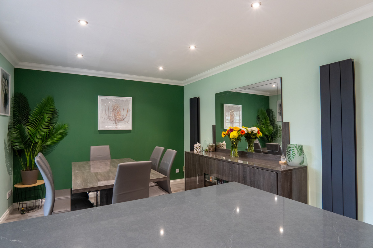 The dining kitchen is a true centrepiece of the home, combining bold design choices with a practical layout. Sleek white cabinets are paired with grey worktops, with the surface extending seamlessly to form a breakfast bar that visually separates the kitchen from the dining area. Grey-toned hexagonal splashback panels add striking contrast against the green painted walls. Stylish lighting runs beneath the wall-mounted units and along the floor-level kickboards, giving the space an impressive ambient glow. A built-in double oven sits at eye level beside the electric hob with extractor hood above. The dining area provides space for a large table and chairs, flanked by two tall dark grey radiators.