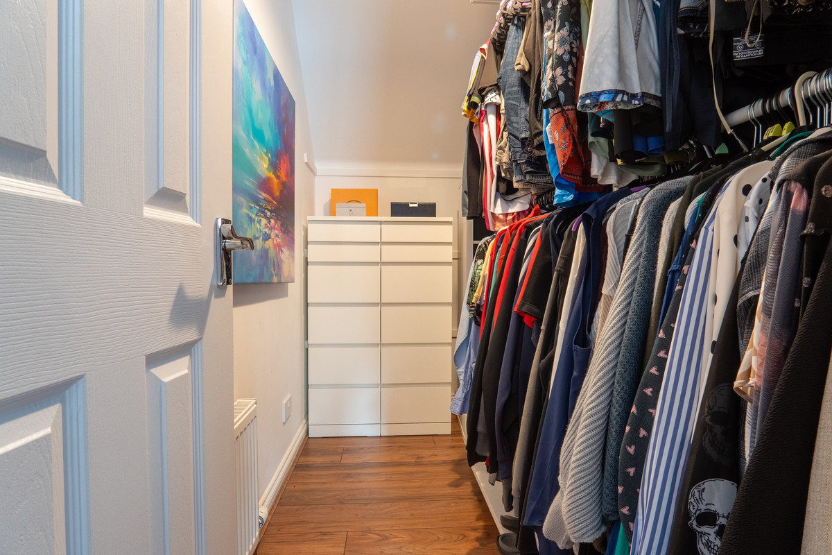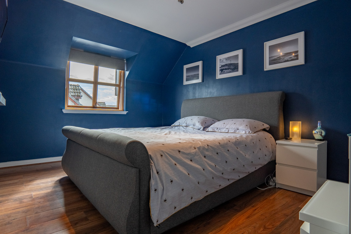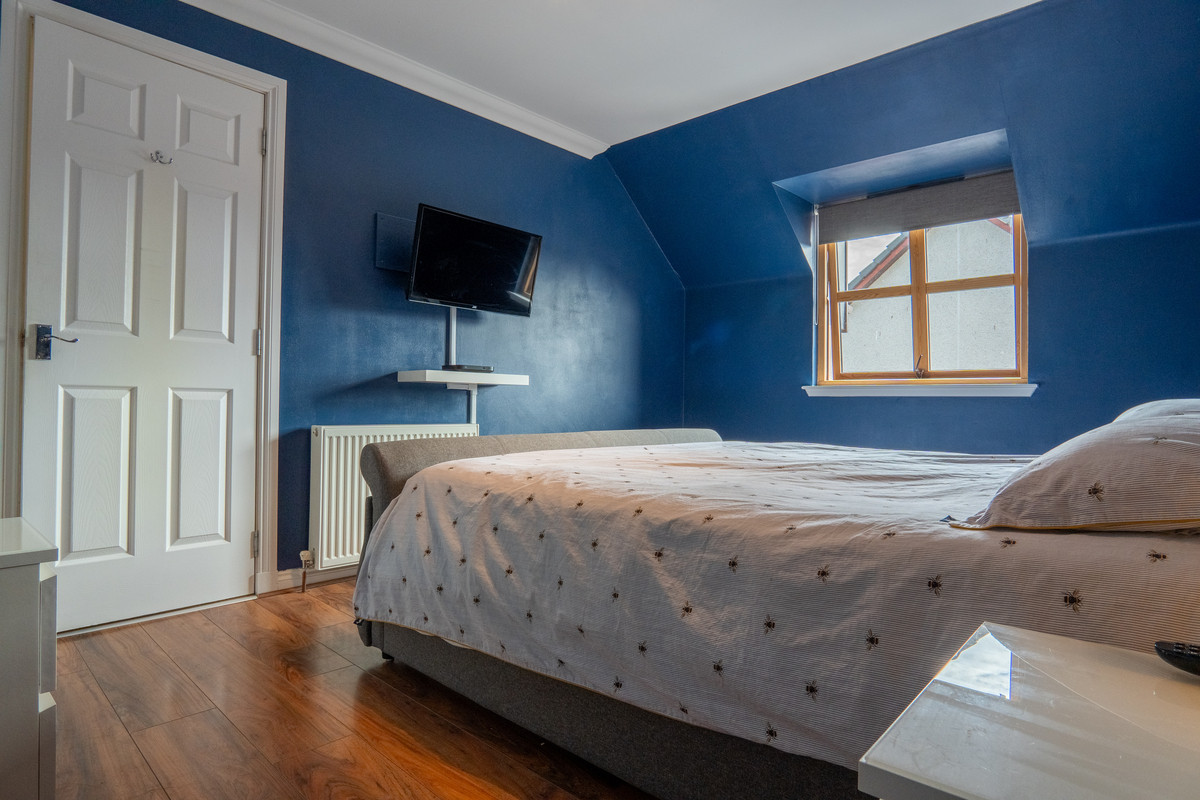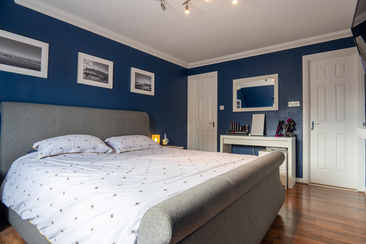 A white-painted staircase with a grey tartan-style carpet leads to the upper floor landing, where four generous bedrooms and the family bathroom are located. The master bedroom is a spacious double with dark blue walls contrasting against bright white detailing. The room includes a walk-in wardrobe fitted with rails for storage. Its en-suite shower room includes a curved corner shower cubicle with a mixer shower, white toilet and basin, a chrome ladder radiator and a frosted window for light and ventilation. The second bedroom is a large double room with white painted walls, a dormer window, radiator and a built-in mirror fronted wardrobe. It shares the same stylish wood flooring as the other bedrooms.