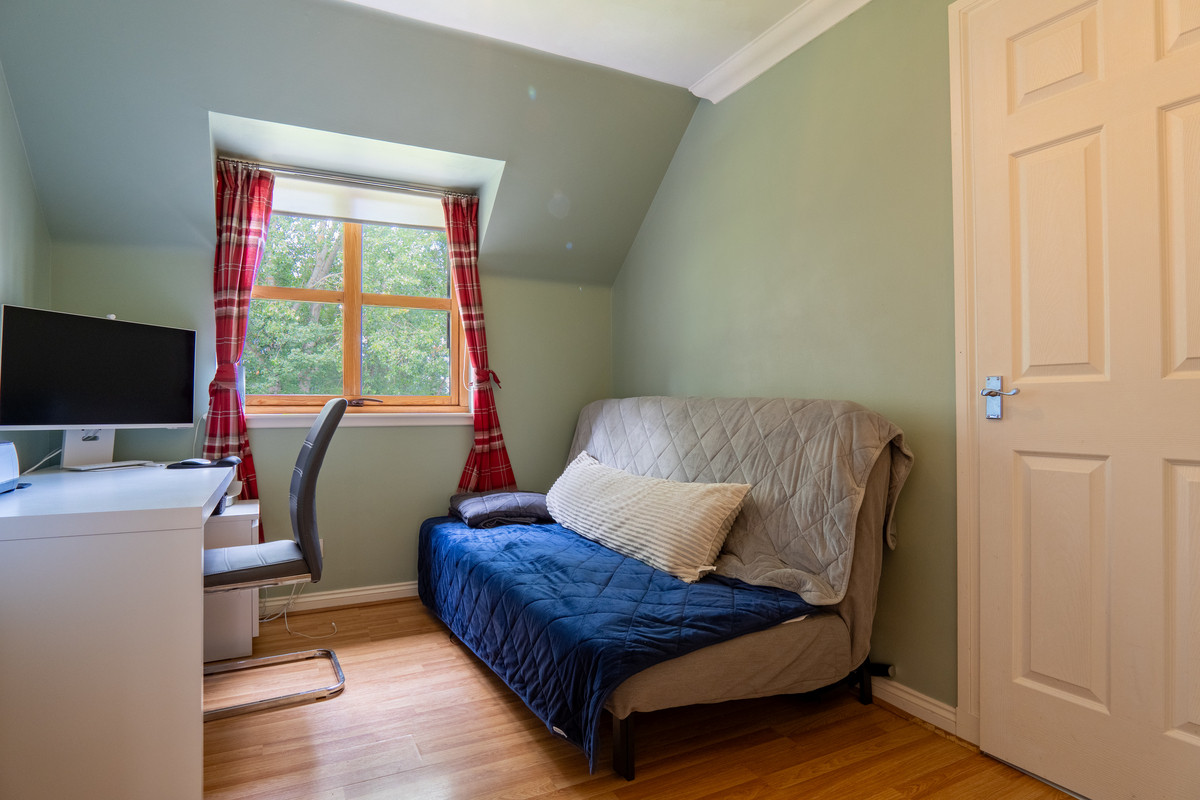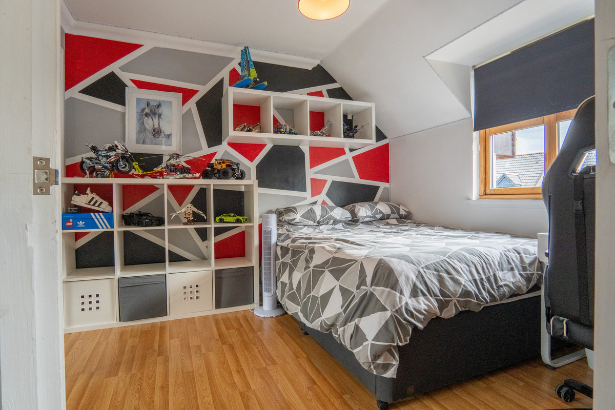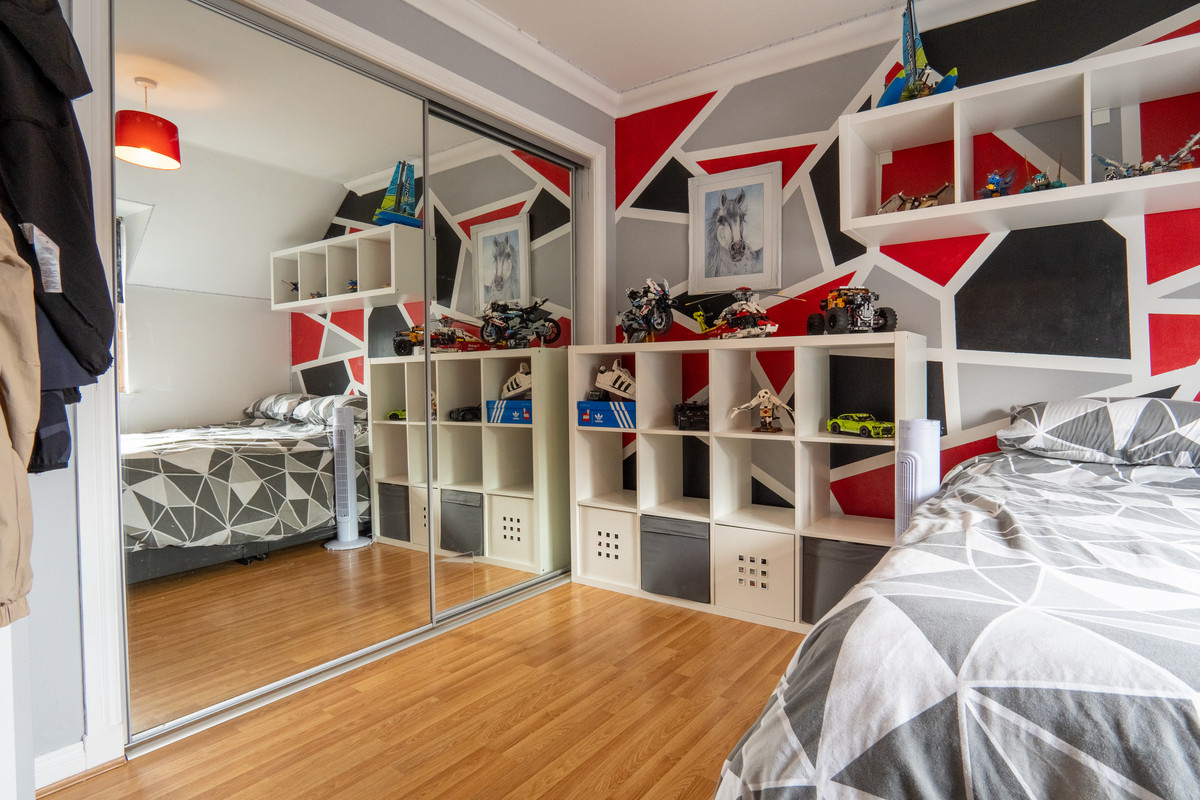 Another double bedroom features a bold feature wall with geometric painted patterns in black, red, grey and white. This distinctive touch adds personality to the space, which also includes neutral walls, mirrored wardrobe doors and ample room for bedroom furniture. The fourth bedroom has a sloped ceiling and dormer window, with light-coloured walls and wood flooring. It is currently used as a home office, with space for a desk and sofa while a radiator is positioned by the door.
