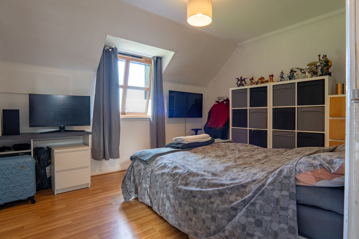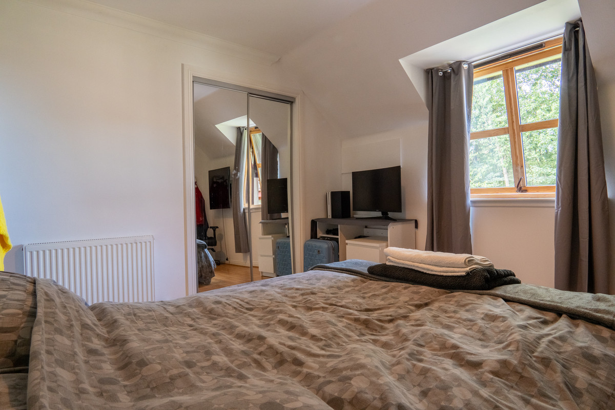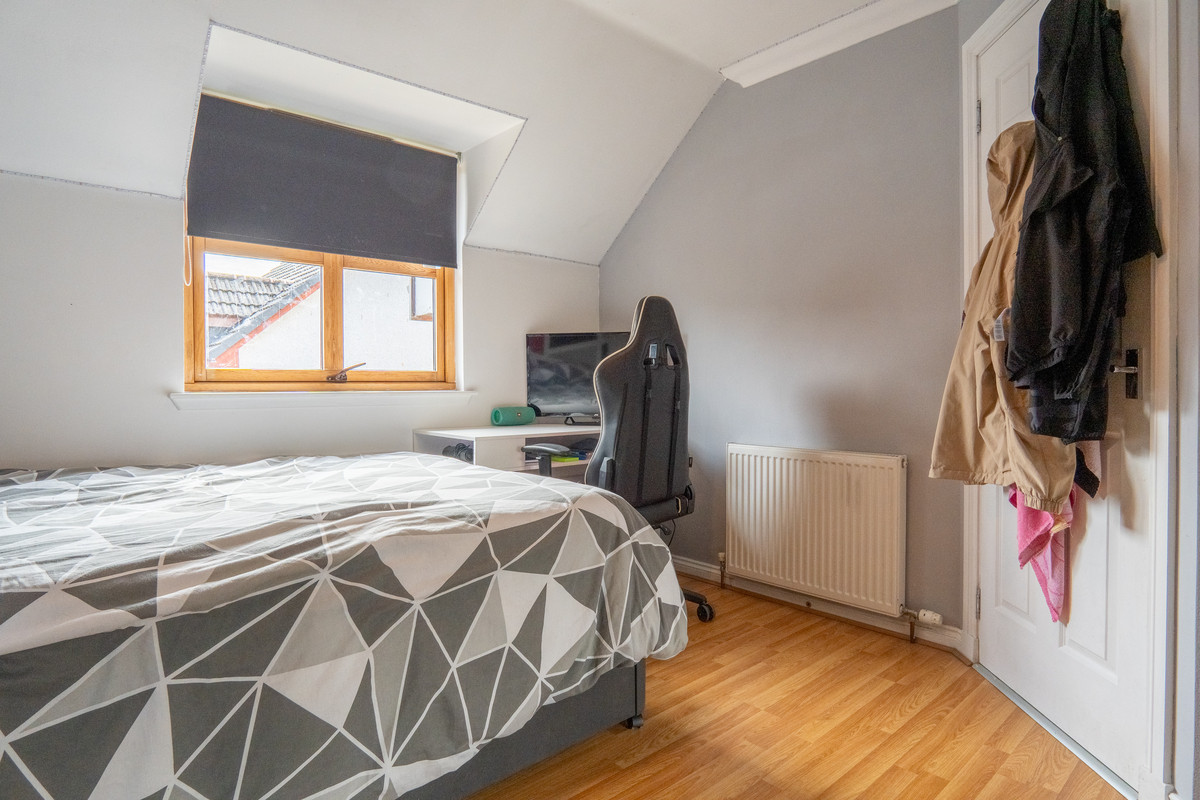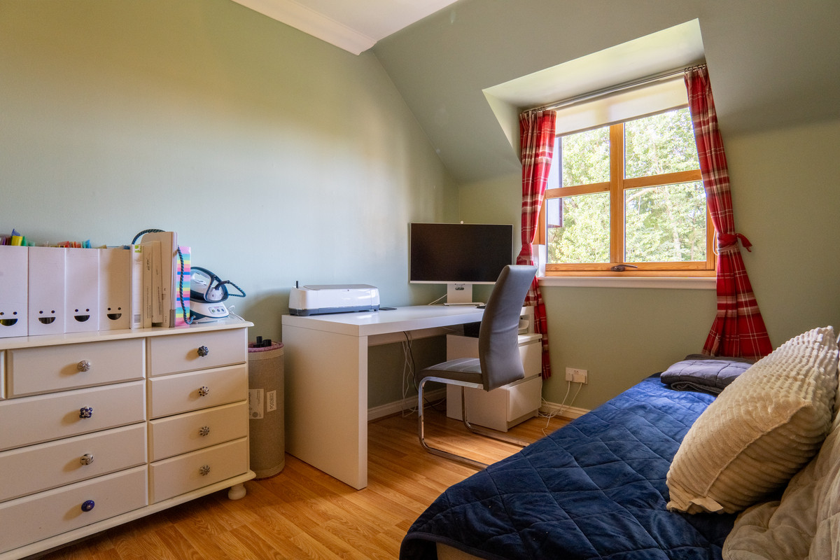 Another double bedroom features a bold feature wall with geometric painted patterns in black, red, grey and white. This distinctive touch adds personality to the space, which also includes neutral walls, mirrored wardrobe doors and ample room for bedroom furniture. The fourth bedroom has a sloped ceiling and dormer window, with light-coloured walls and wood flooring. It is currently used as a home office, with space for a desk and sofa while a radiator is positioned by the door.