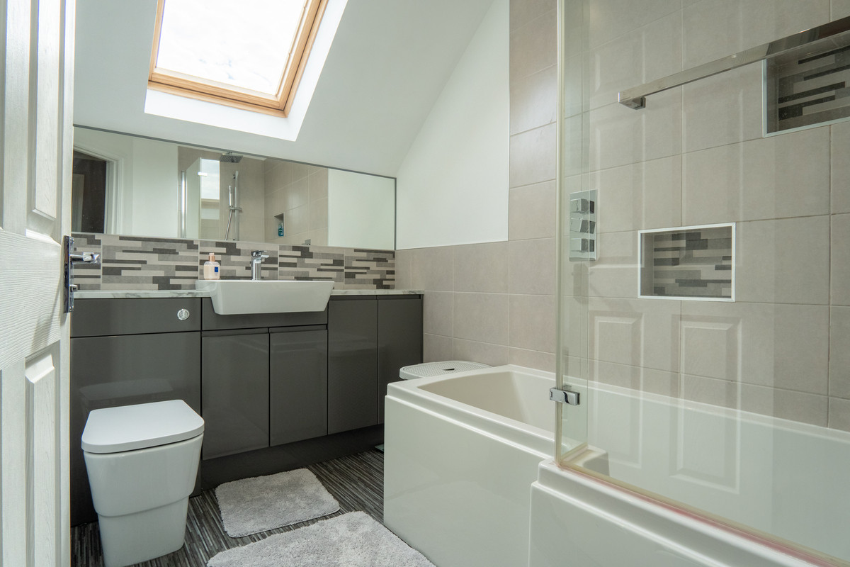 The modern family bathroom contains a glossy grey vanity unit running along one wall, housing the toilet and sink, with built-in cupboards for storage. A long wall mirror sits above the unit. The white bath includes a mixer shower above and a shower screen to the side, with large tiles surrounding the this area for a clean and functional finish. A Velux window brings in natural light from above.
