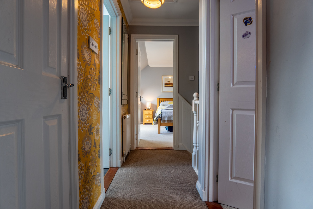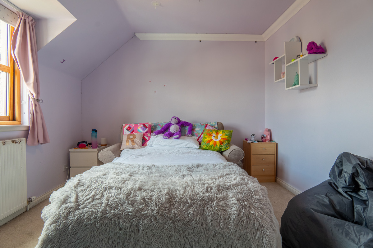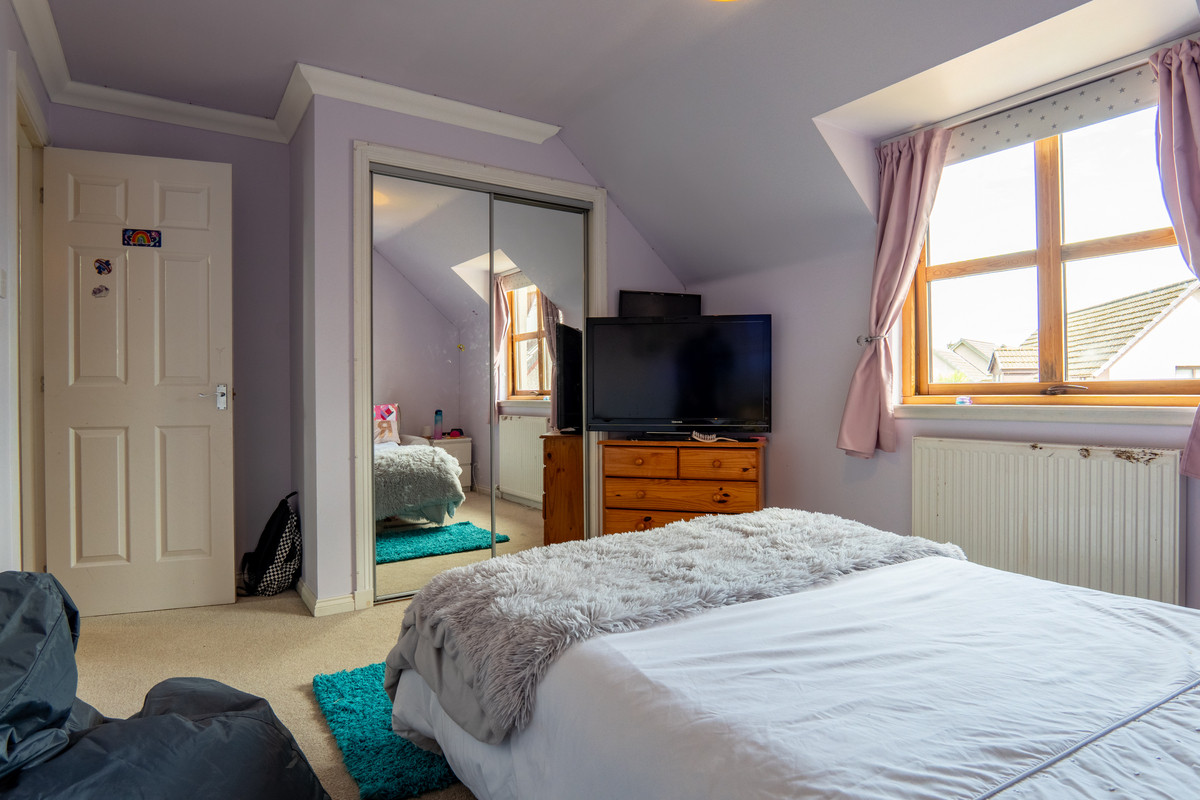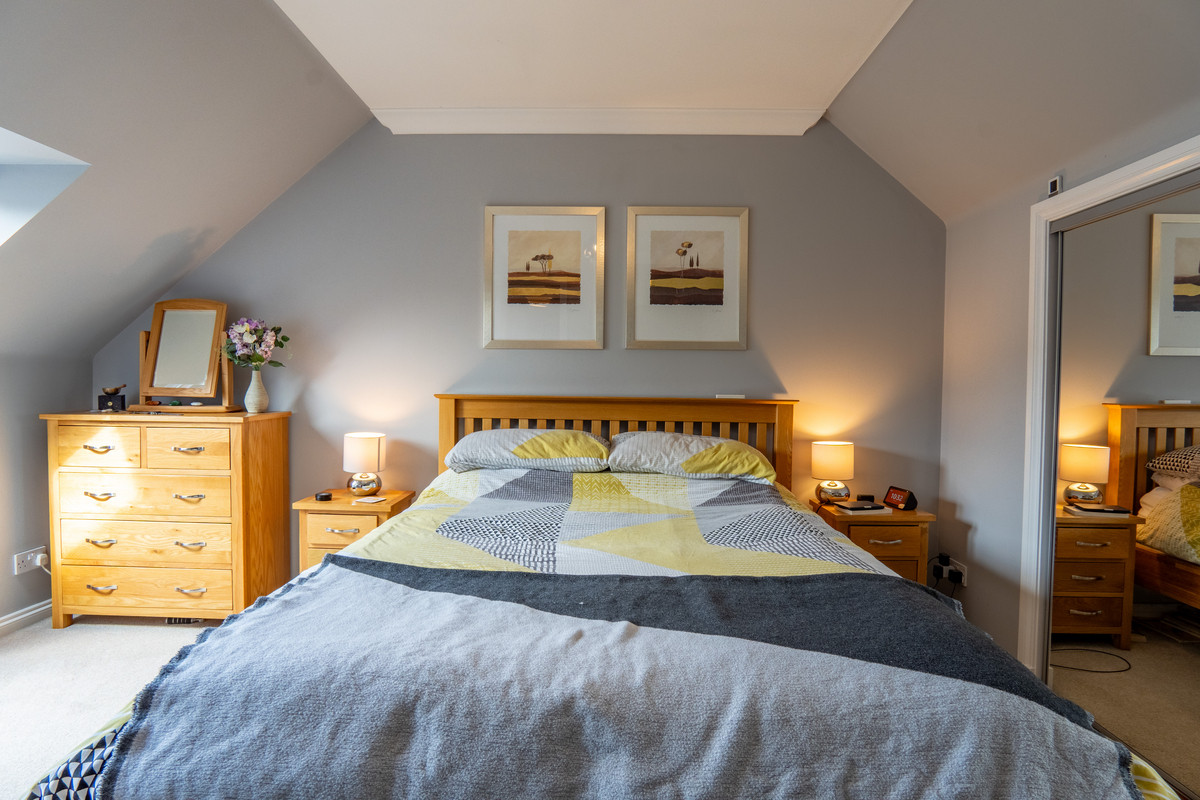 Upstairs, the landing connects to three generous bedrooms and the family bathroom. The main bedroom is a large, airy double room with twin Velux-style roof windows bringing in plenty of natural light. The soft grey walls and matching carpet create a relaxing tone, while a full-width built-in wardrobe with mirrored sliding doors ensures excellent storage.