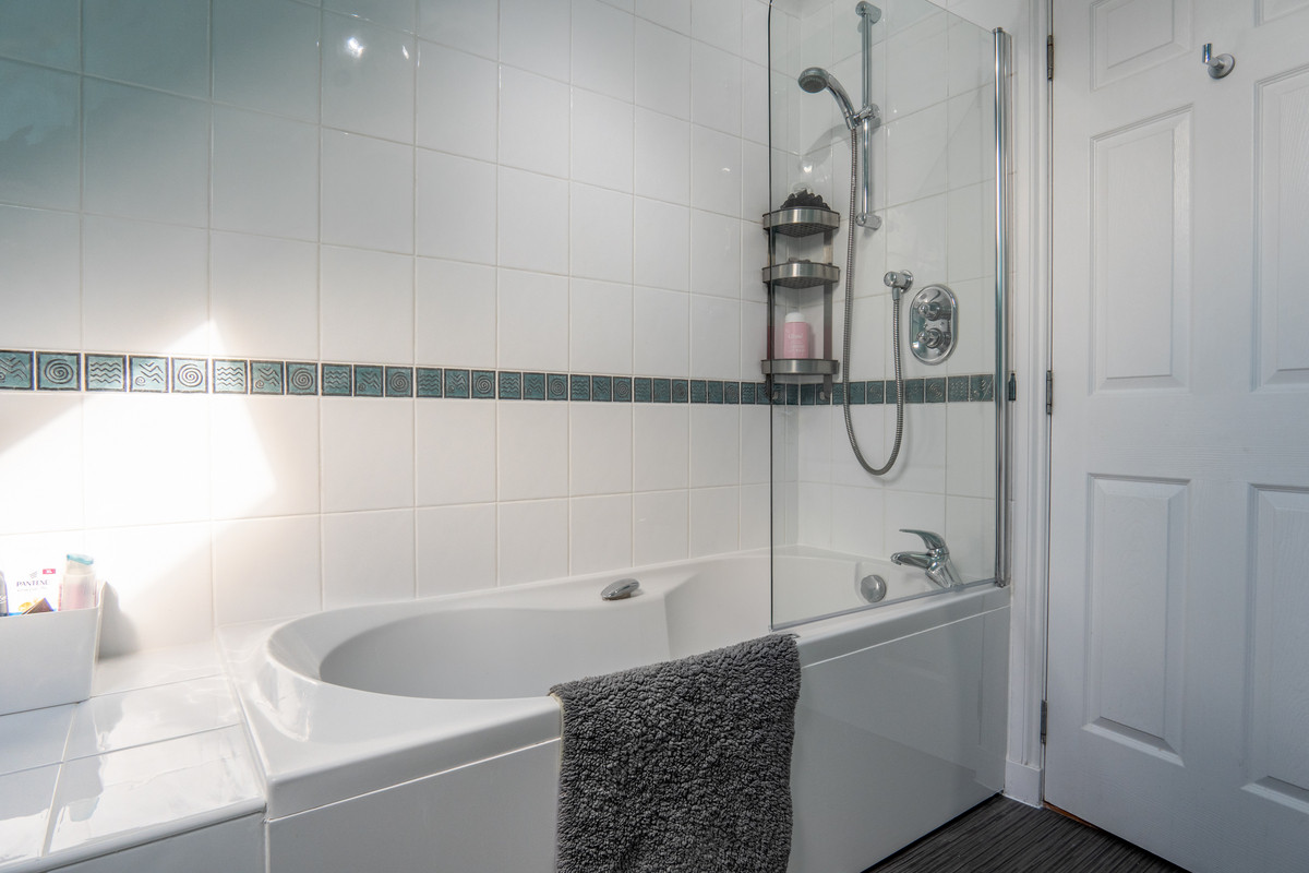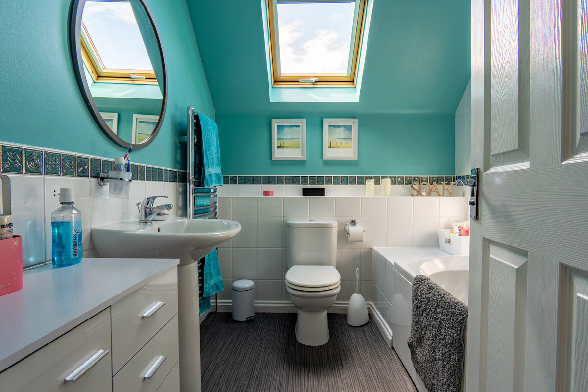 The family bathroom is bright and fresh, finished with crisp white tiling to the lower walls and a distinctive sea green shade above. A mixer shower with screen is positioned above the bath while a mirror sits neatly above the basin. There’s a chrome ladder-style radiator for towels and warmth, grey laminate flooring and a Velux-style window for natural light and ventilation.