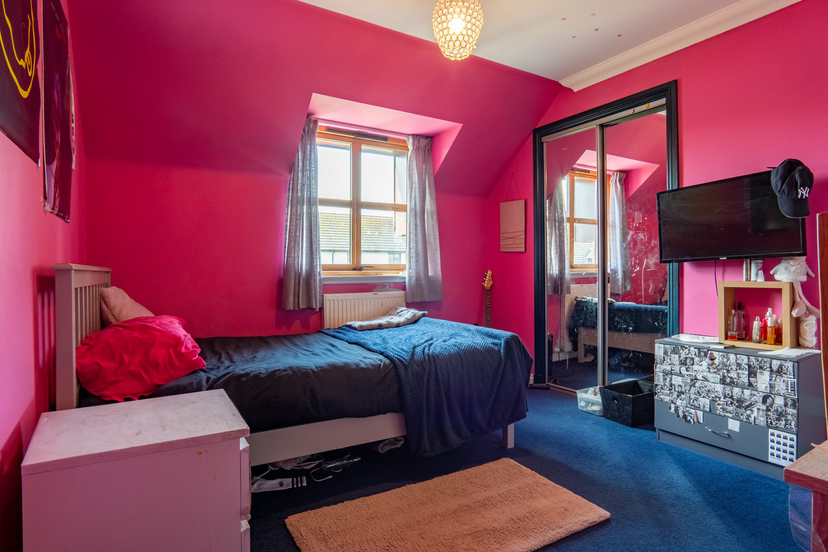 The third bedroom stands out with bold pink walls and a dark blue carpet. This room includes a smaller mirrored wardrobe, a dormer window to the rear and a radiator below. Its cheerful palette could easily be refreshed to suit a wide range of tastes or uses.