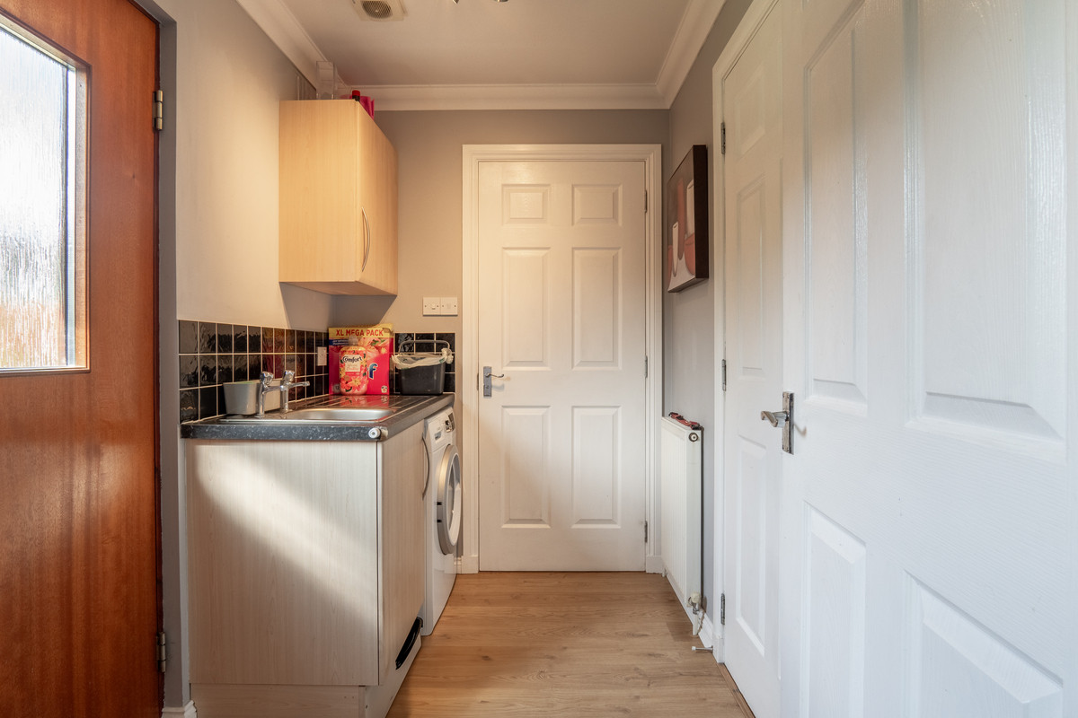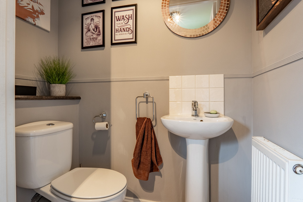 Off the kitchen is a dedicated utility room fitted with additional cupboards and a stainless steel sink. There’s also plumbing and space for a washing machine. Beyond this, a cloakroom WC adds everyday convenience with a white toilet and basin set against light grey walls, perfect for busy family life or when guests visit.