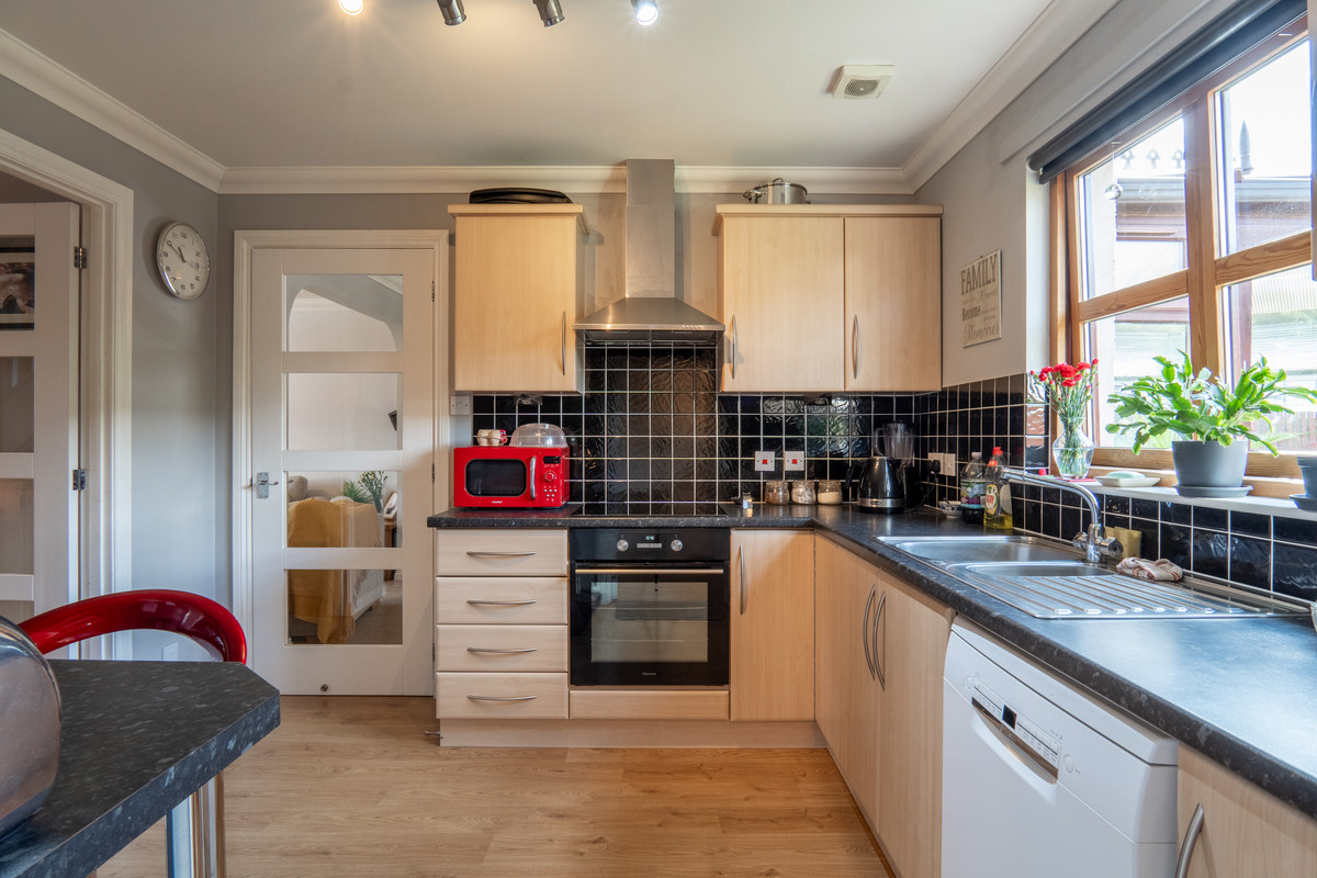 Back inside, the kitchen offers a smart design with light wood-coloured cabinetry and sleek black acrylic worktops. The splashback tiling in glossy black adds contrast to the light grey painted walls. Integrated appliances include an oven, hob and extractor, with a stainless steel sink and space for a dishwasher. A small breakfast bar sits above a wall-mounted radiator, offering a useful spot for quick meals or a morning coffee.
