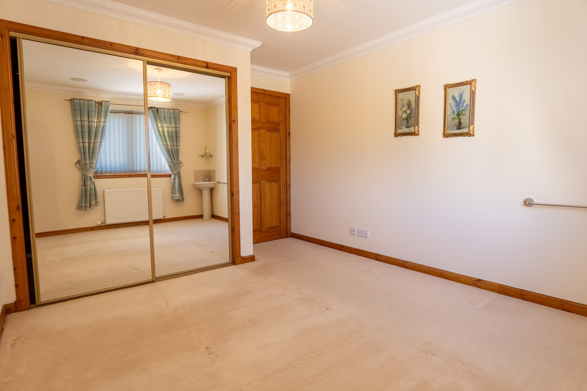 A third double bedroom features cream walls, beige carpet and a large built-in-wardrobe. A wash basin is positioned discreetly in the corner and a window with radiator below brings in natural light and views to the hills.