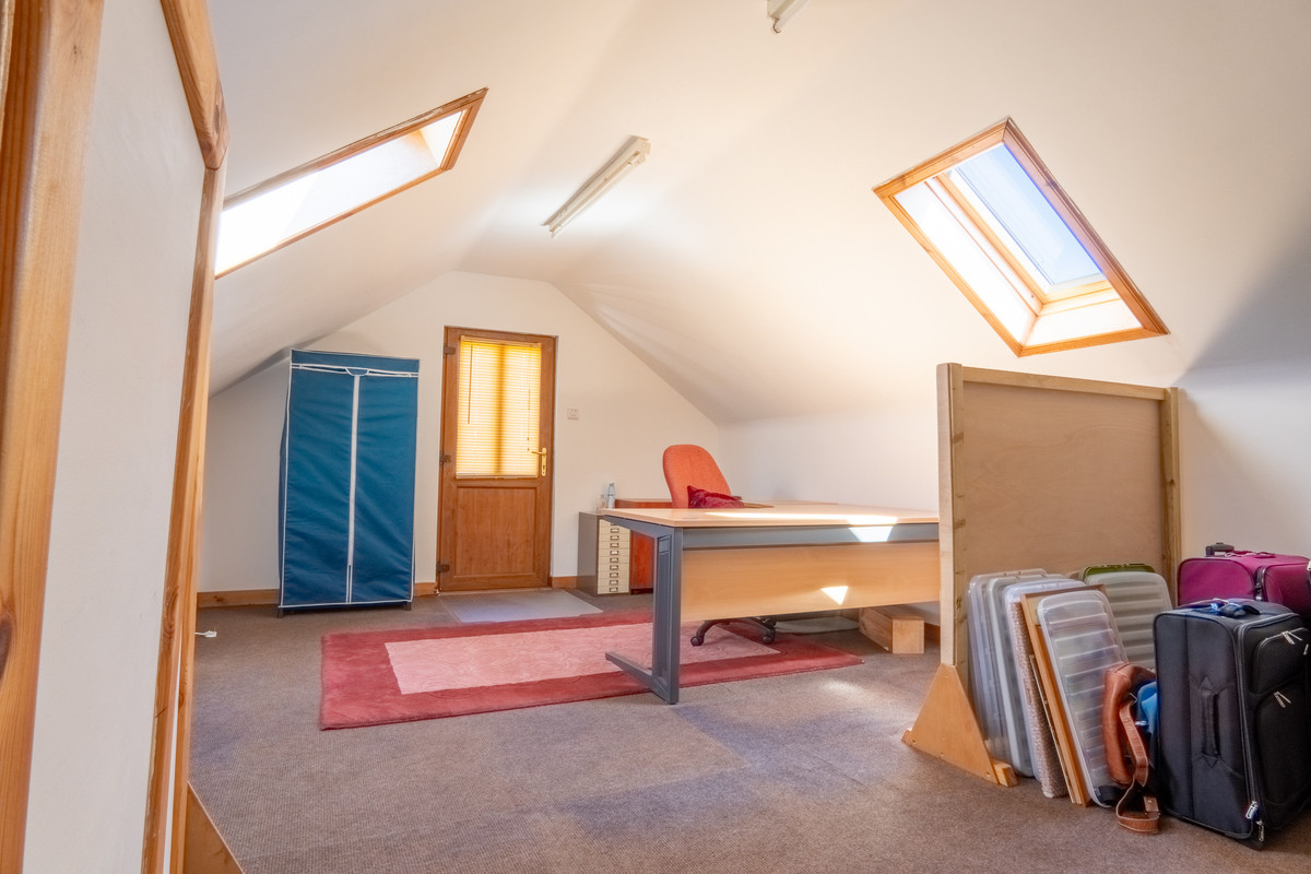 Detached from the main house is a double garage with power, lighting and water, offering useful storage, workshop space or house two cars. Above, accessed via external metal stairs, is a bright, carpeted room with white painted walls, Velux-style windows and a small wall heater – ideal as a workspace, hobby room or quiet retreat.